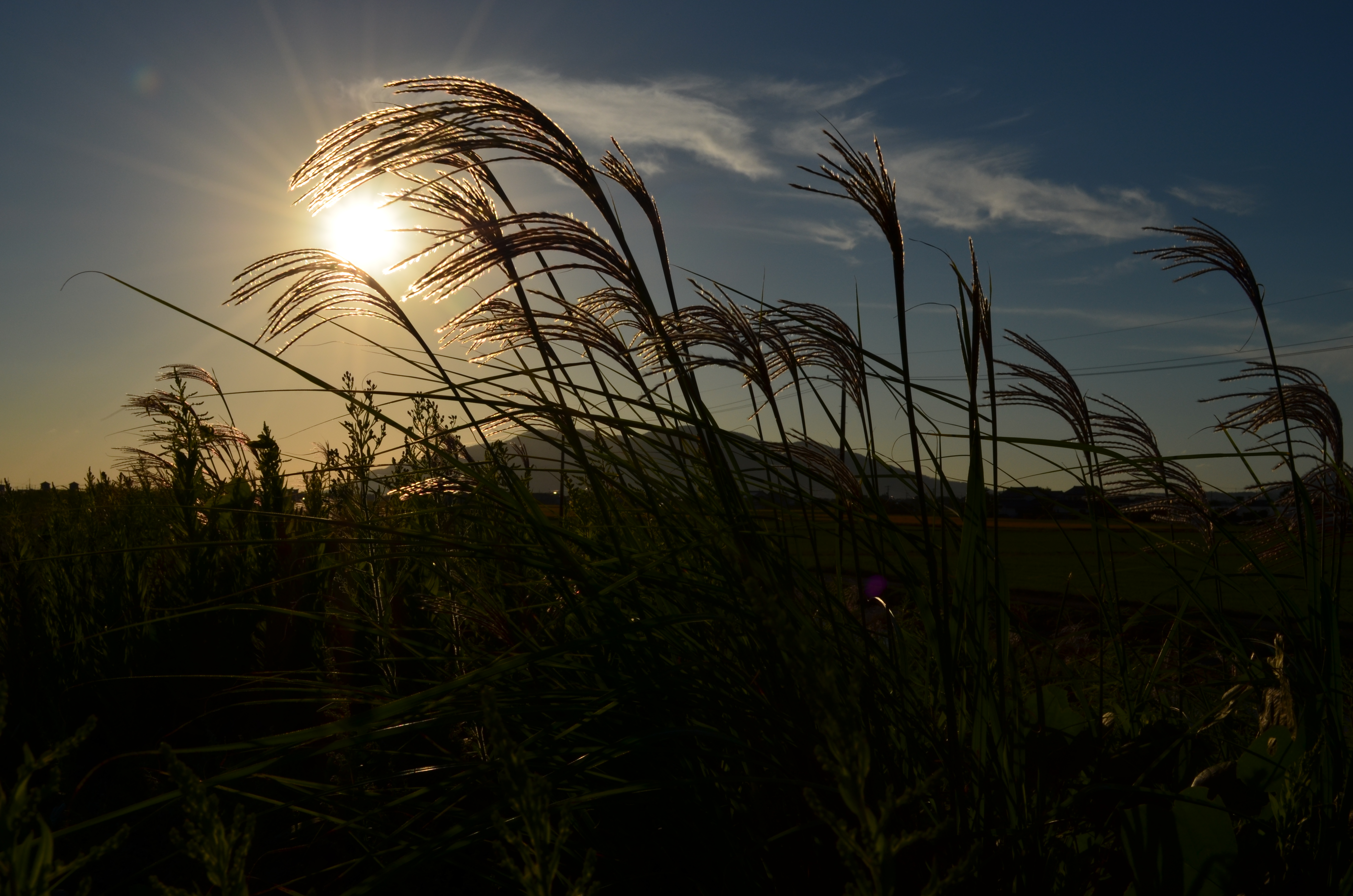 夕日を浴びながら、銀色に輝き揺れるススキ。見慣れた光景ですが、見飽きることはありません。