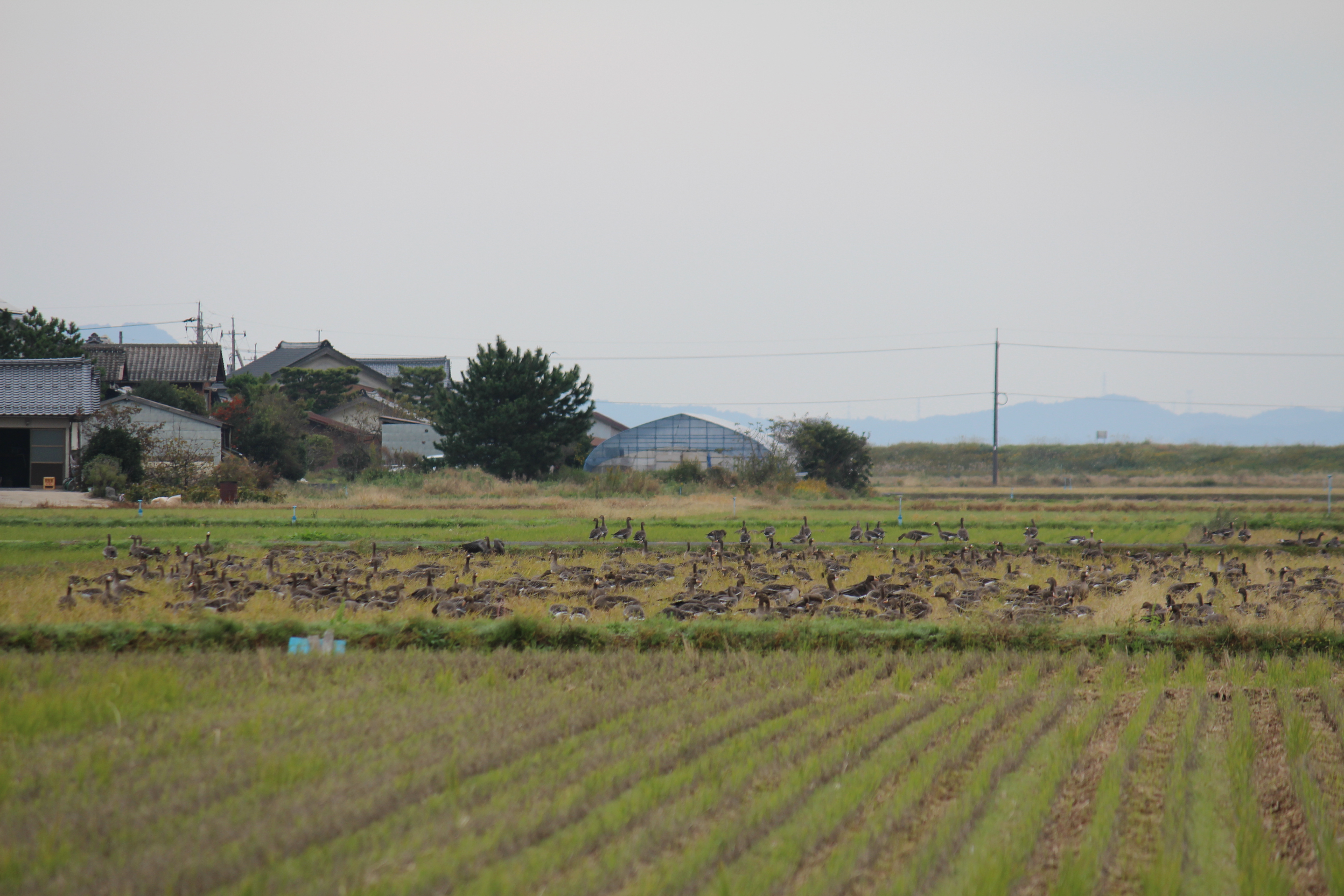 そして、近くの田んぼには、こちらも冬の使者で、コハクチョウ達より一足早く飛来しているマガンも乱舞していました。