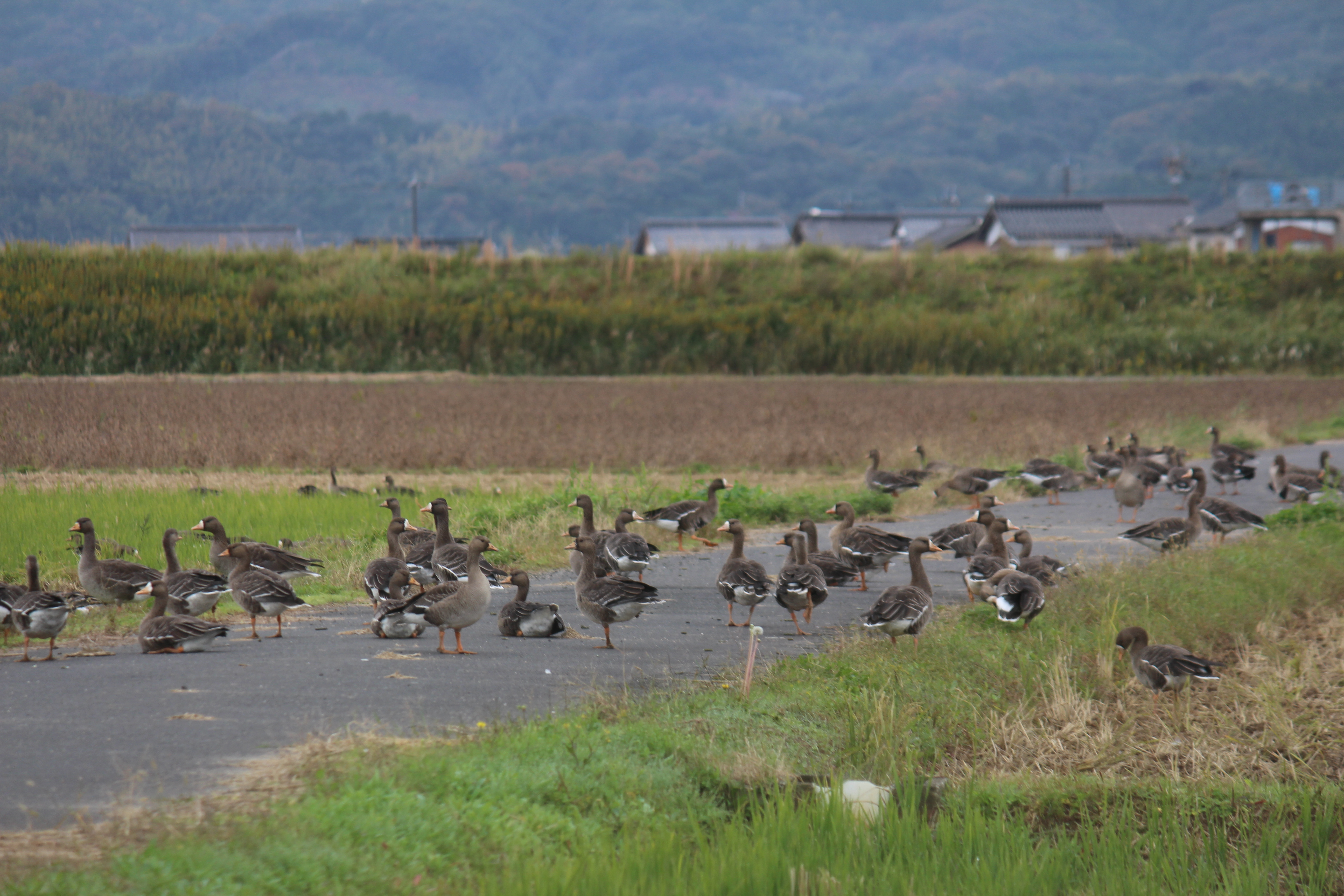 冬の使者マガンの数がかなり増えてきました。民家のすぐ前の田んぼで羽根を休めております。人間の姿に気づくとすぐに飛び立ってしまいますが、車でゆっくり近づくと少し警戒しますが、飛び立ちません。長旅の疲れをゆっくり癒して欲しいものです。