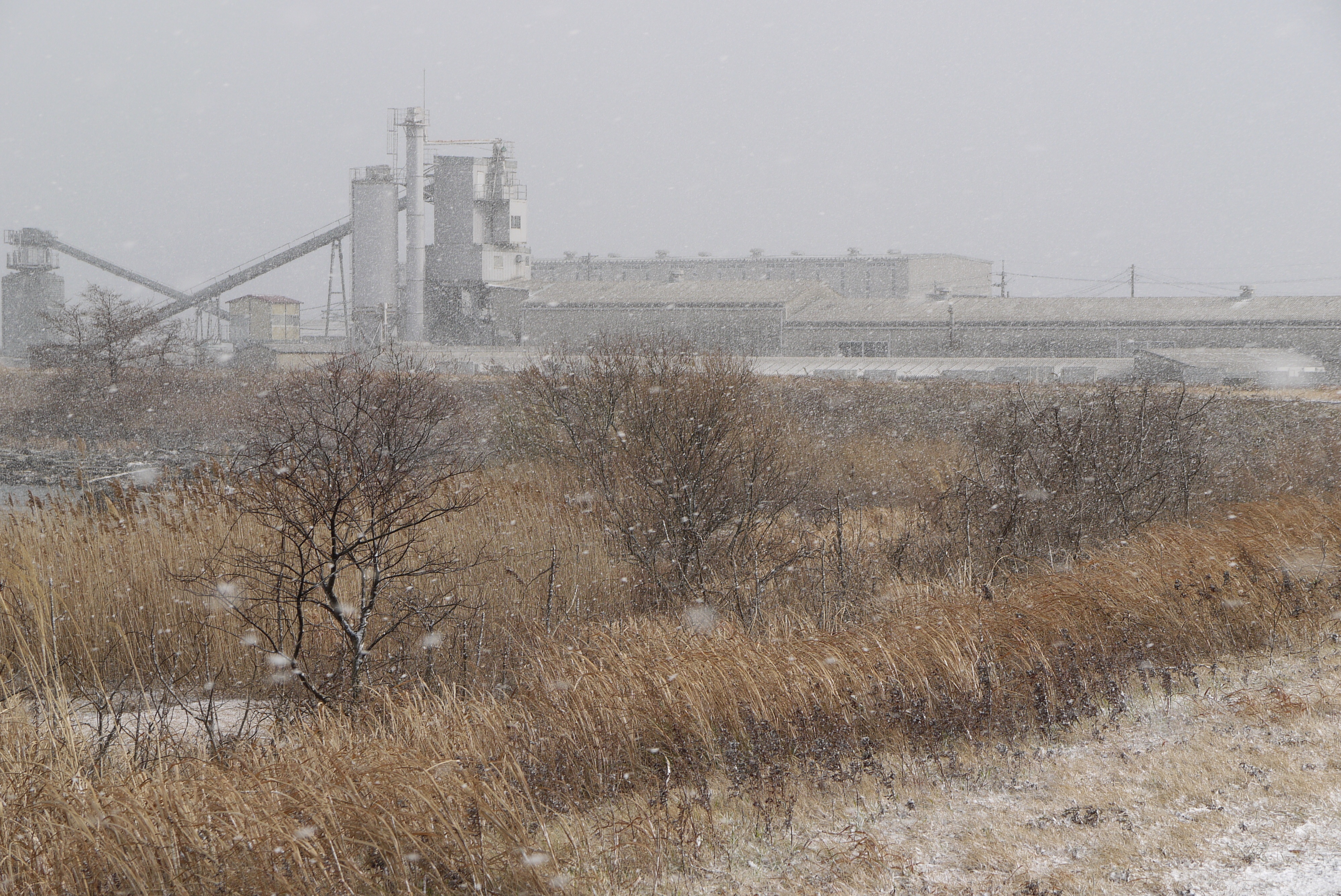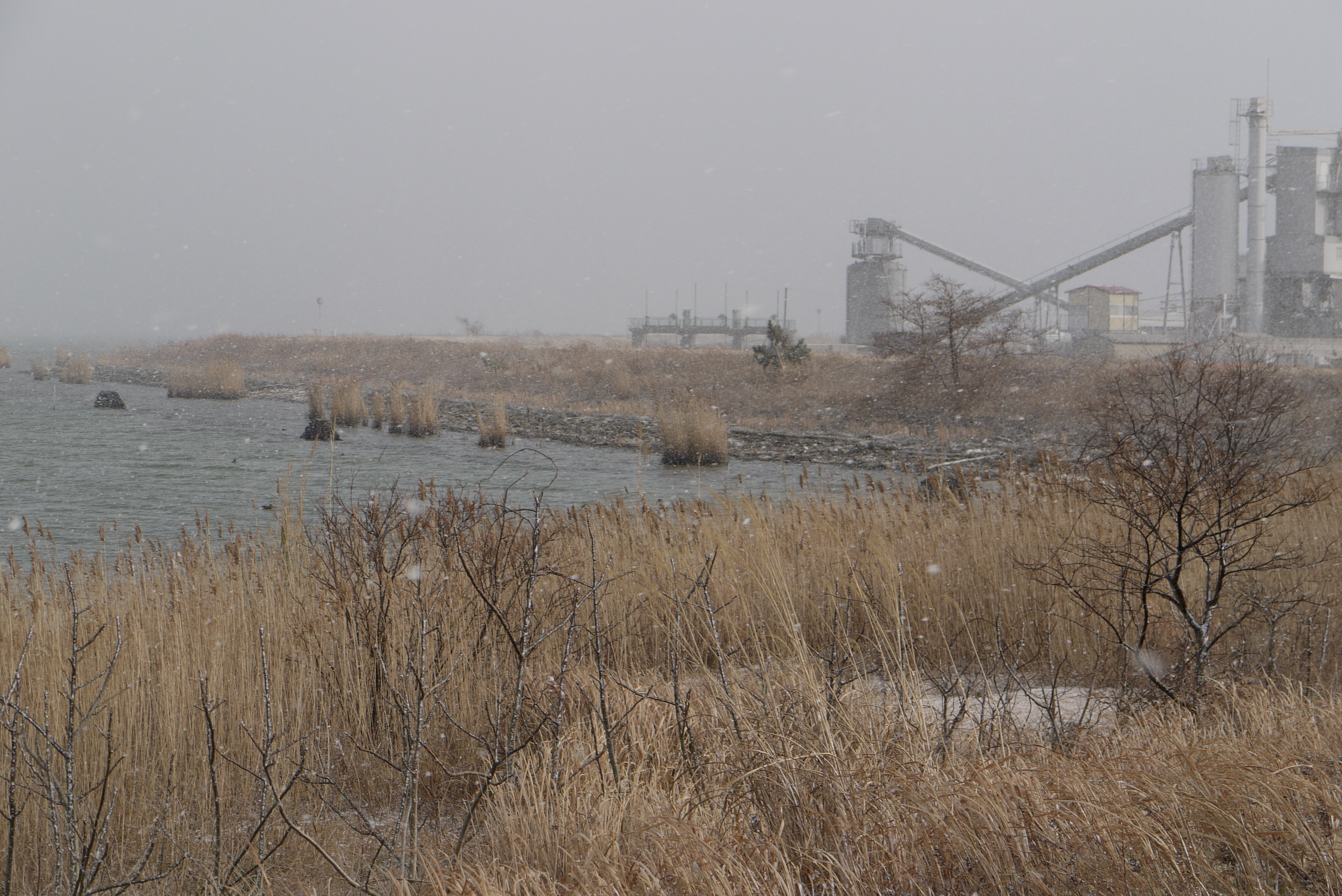 午後4時前なのに夕方のよう。正面は、覆砂作業中のクレーン付き台船。右は、浅場造成用の砂の山