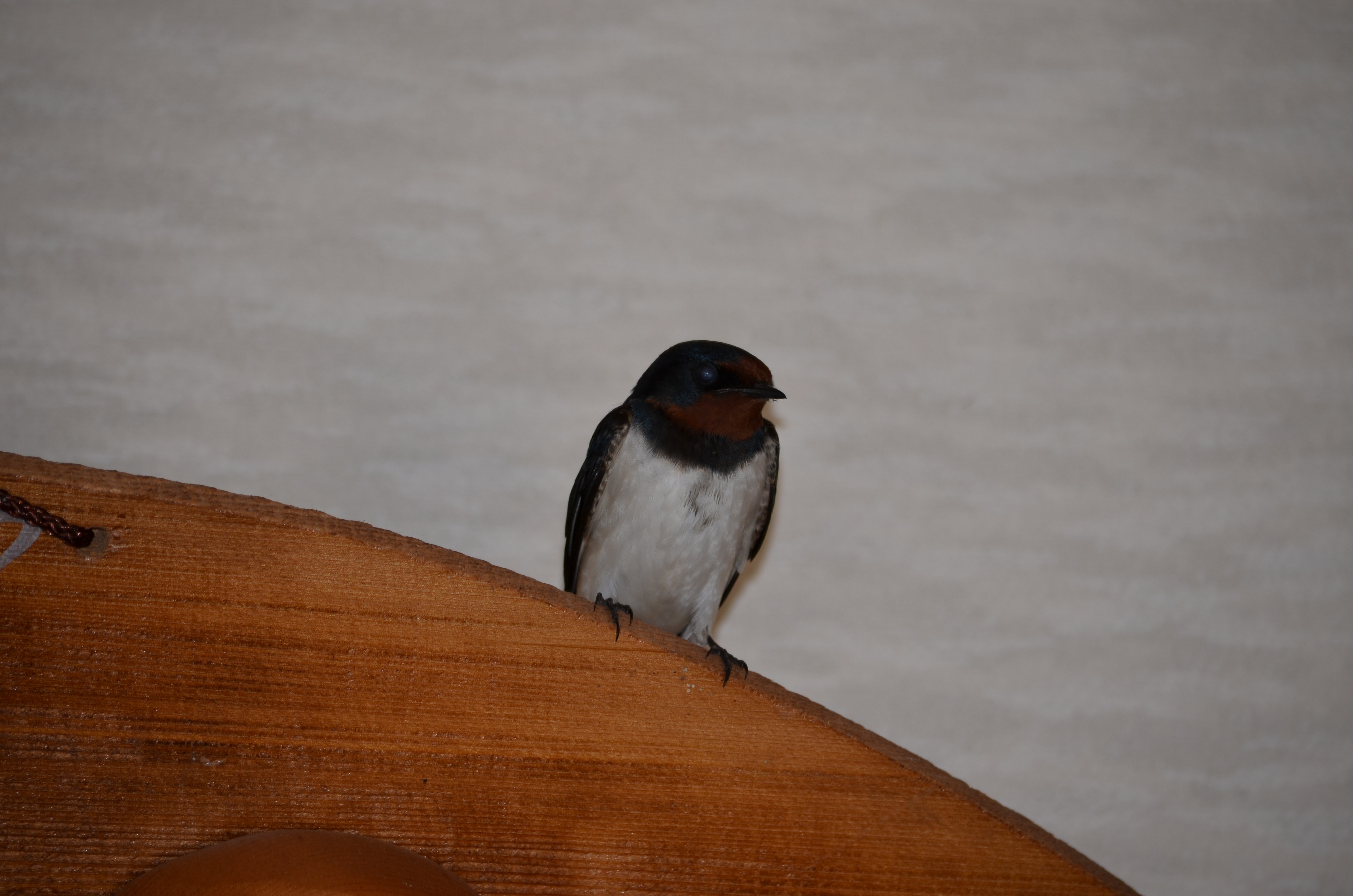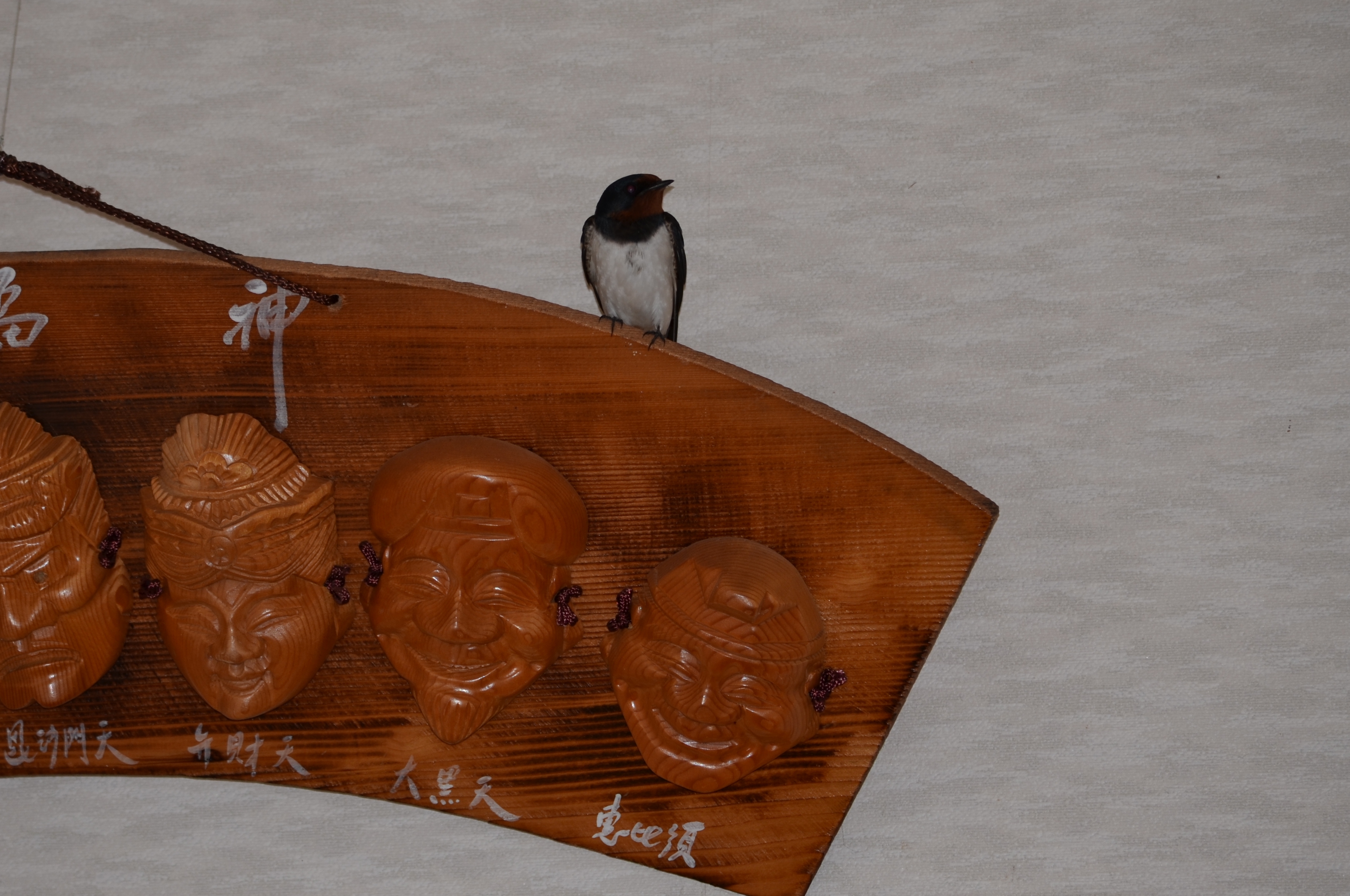 今朝早くから巣を作る場所を見つけようと忙しく飛び回っています。いつも止まる電線にも止まらず、車庫や納屋はもちろん、戸が開いていると玄関からも入ってきて、巣を作るのに具合の良いところはないかと物色しています。写真を撮ろうとしますが、飛んでいるうちは早くてシャッターを切るのが追い付きません。そのうち開いている玄関に入って、壁の七福神の掛物に止まりましたので、急いでシャッターを切ったのがこの写真です。