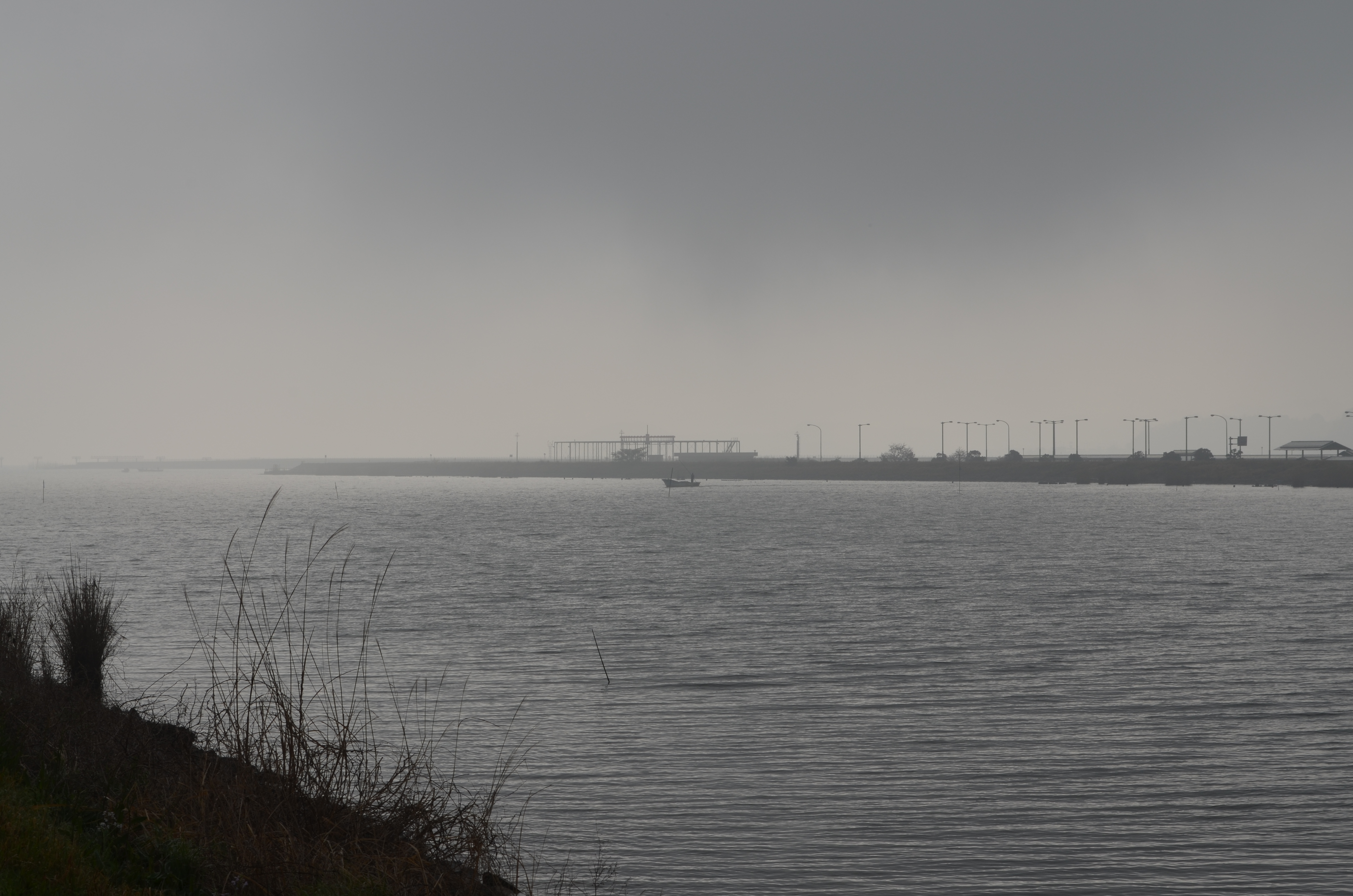 静かな十四間川だが、いつもはたくさんいる水鳥の姿が見えない。正面に見える建物は、新右岸排水機場と湖岸南排水機場