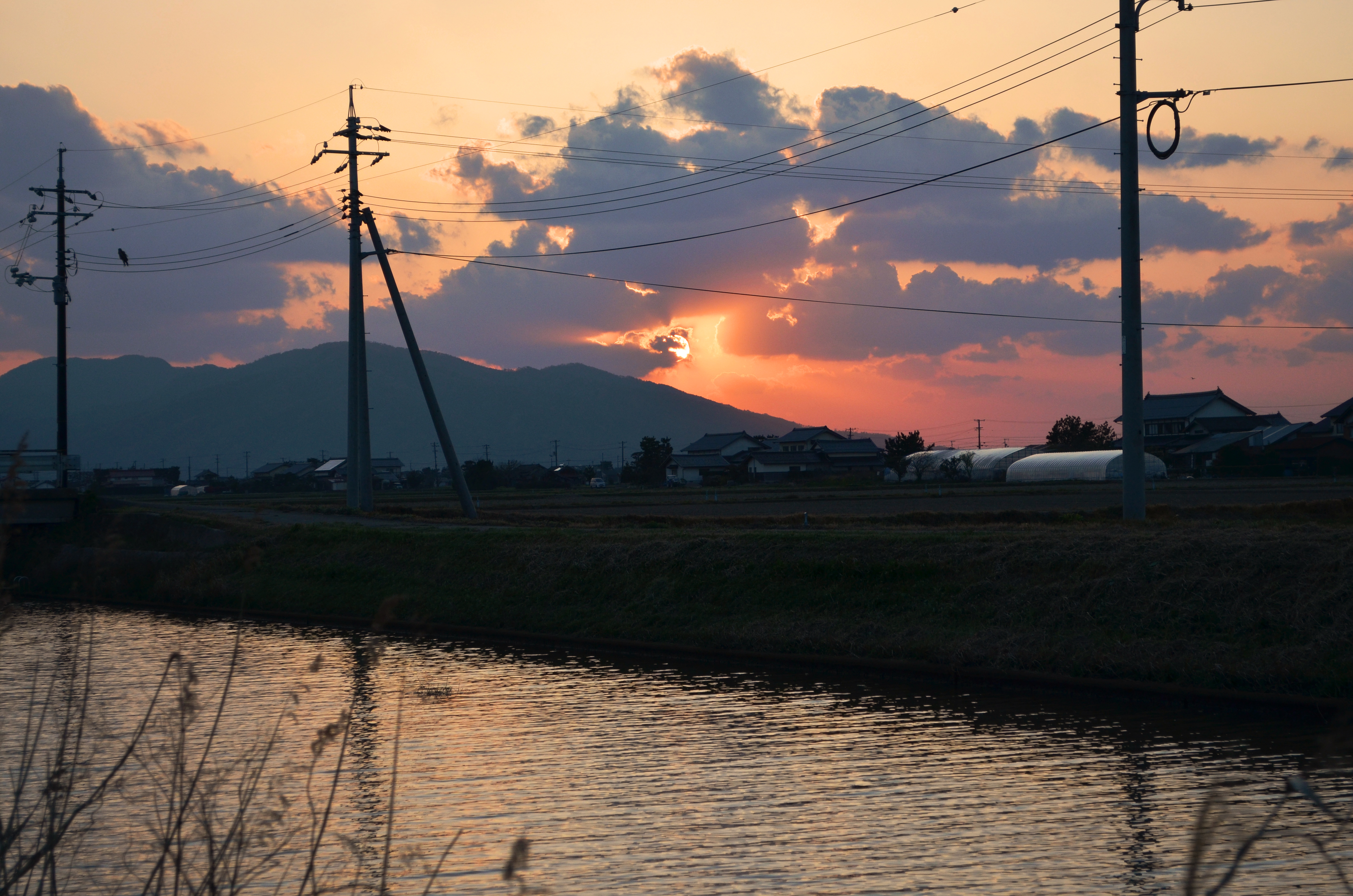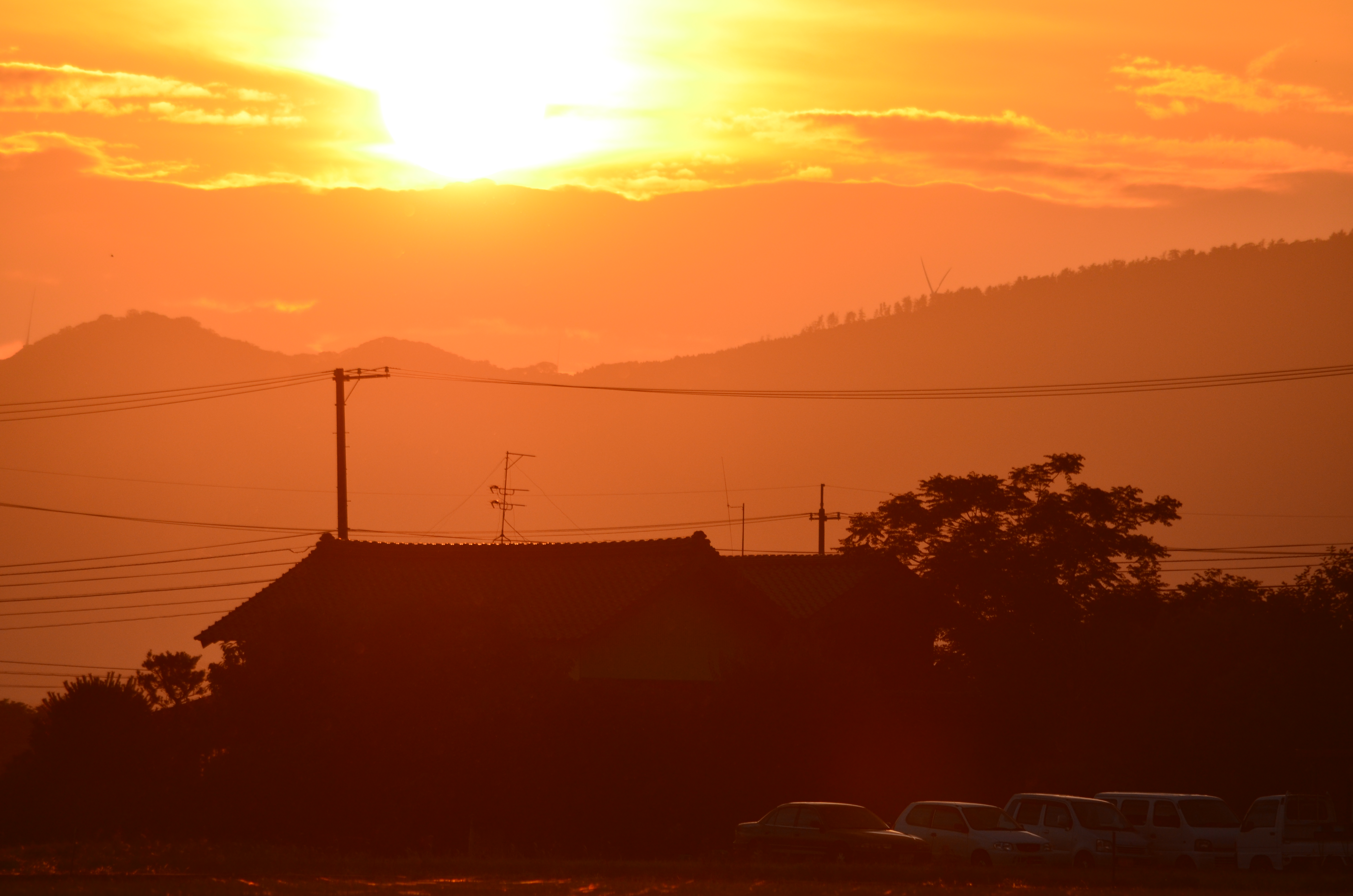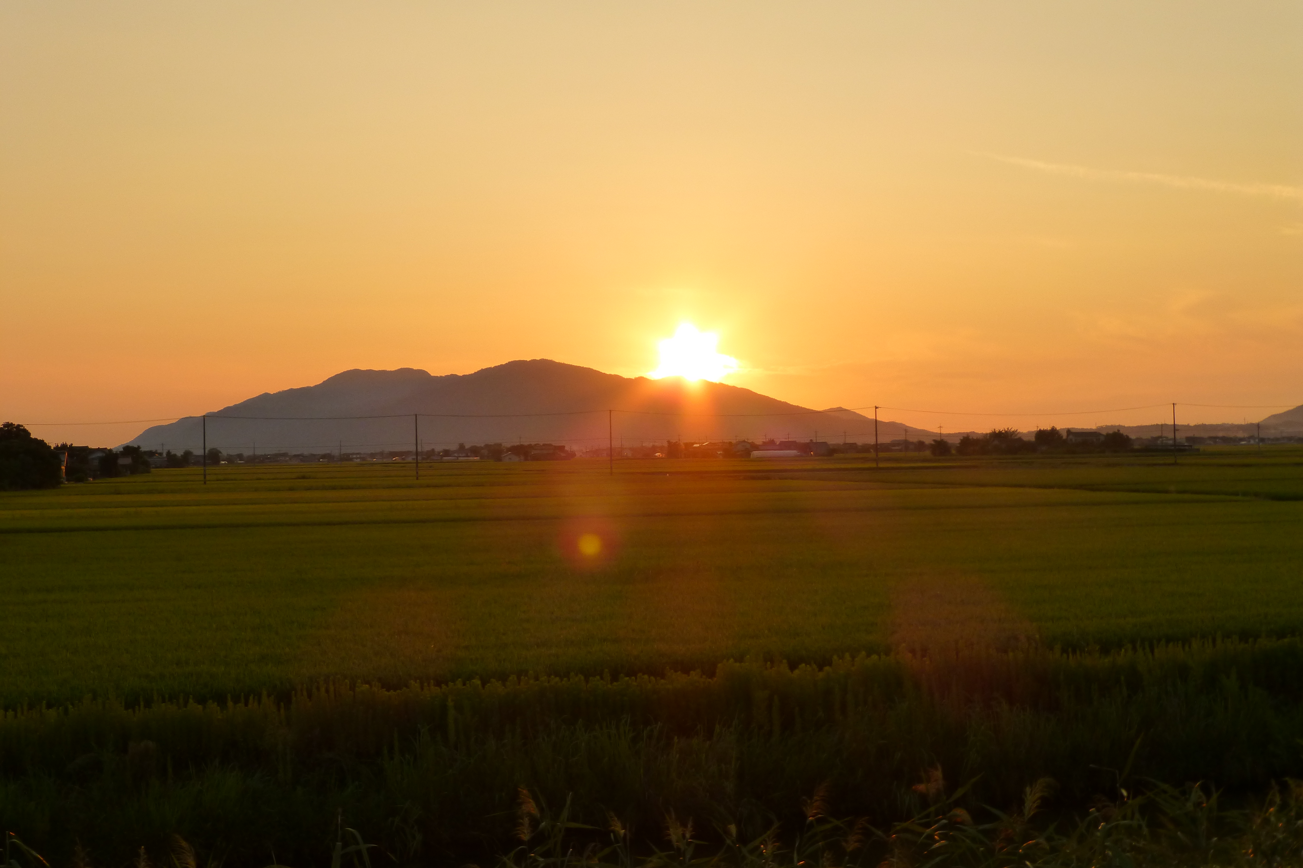 夕焼けといえば、宍道湖を真っ赤に染めて沈む夕日がすぐにイメージされると思いますが、宍道湖西岸に住む私たちの見慣れた夕焼けは、斐川平野を紅に染めながら平田の旅伏山(たぶしやま。456m)に沈む夕日、夕焼けです。宍道湖の夕日ももちろんいいものですが、こちらの夕日も負けず素晴らしいと思います。