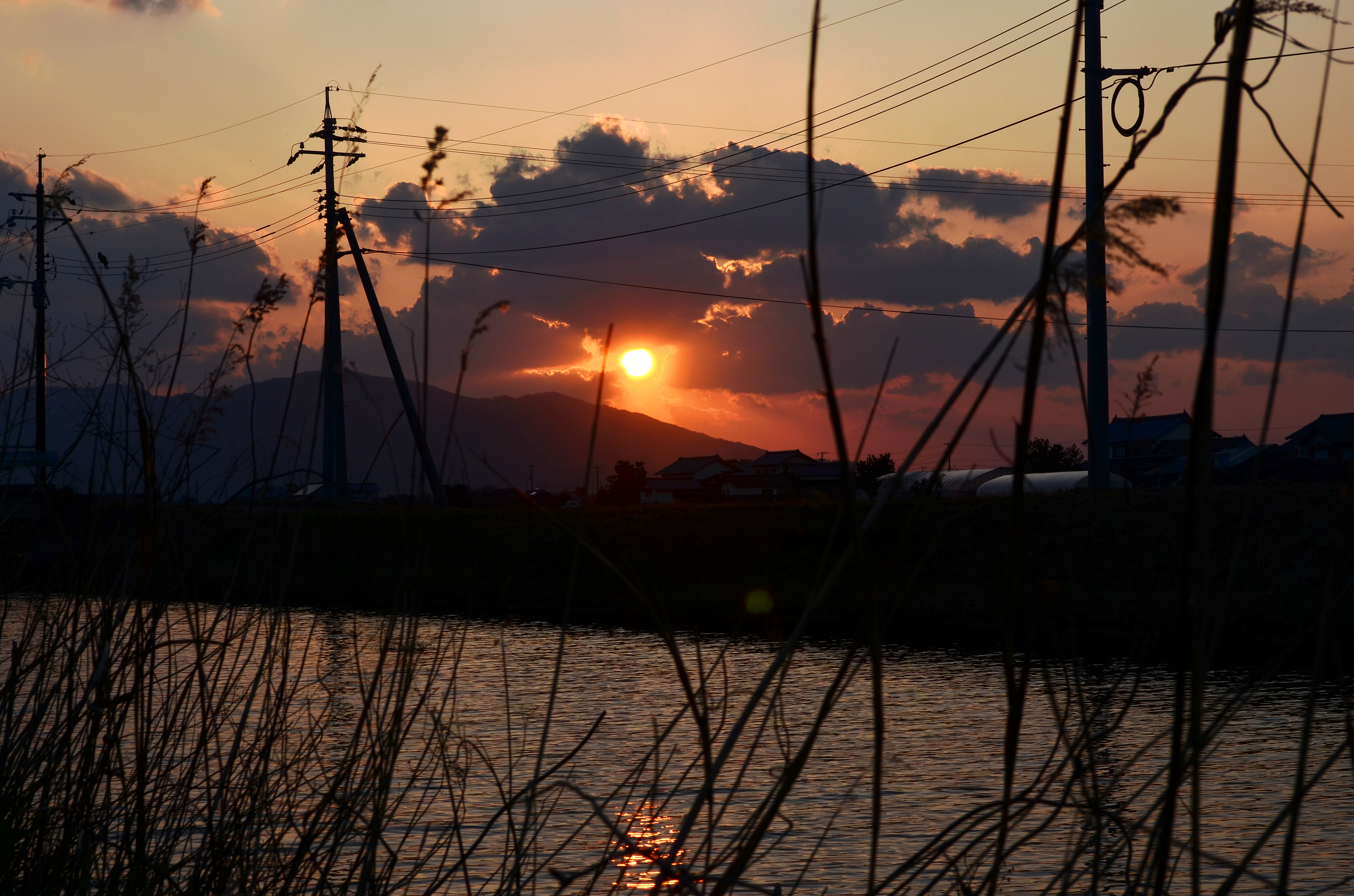 そして、斐伊川河口まで歩いて折り返し十四間川の近くに帰るころには、出かける頃にはまだ高かった秋の日が早くも旅伏山に真っ赤に燃えながら入ろうとしていました。