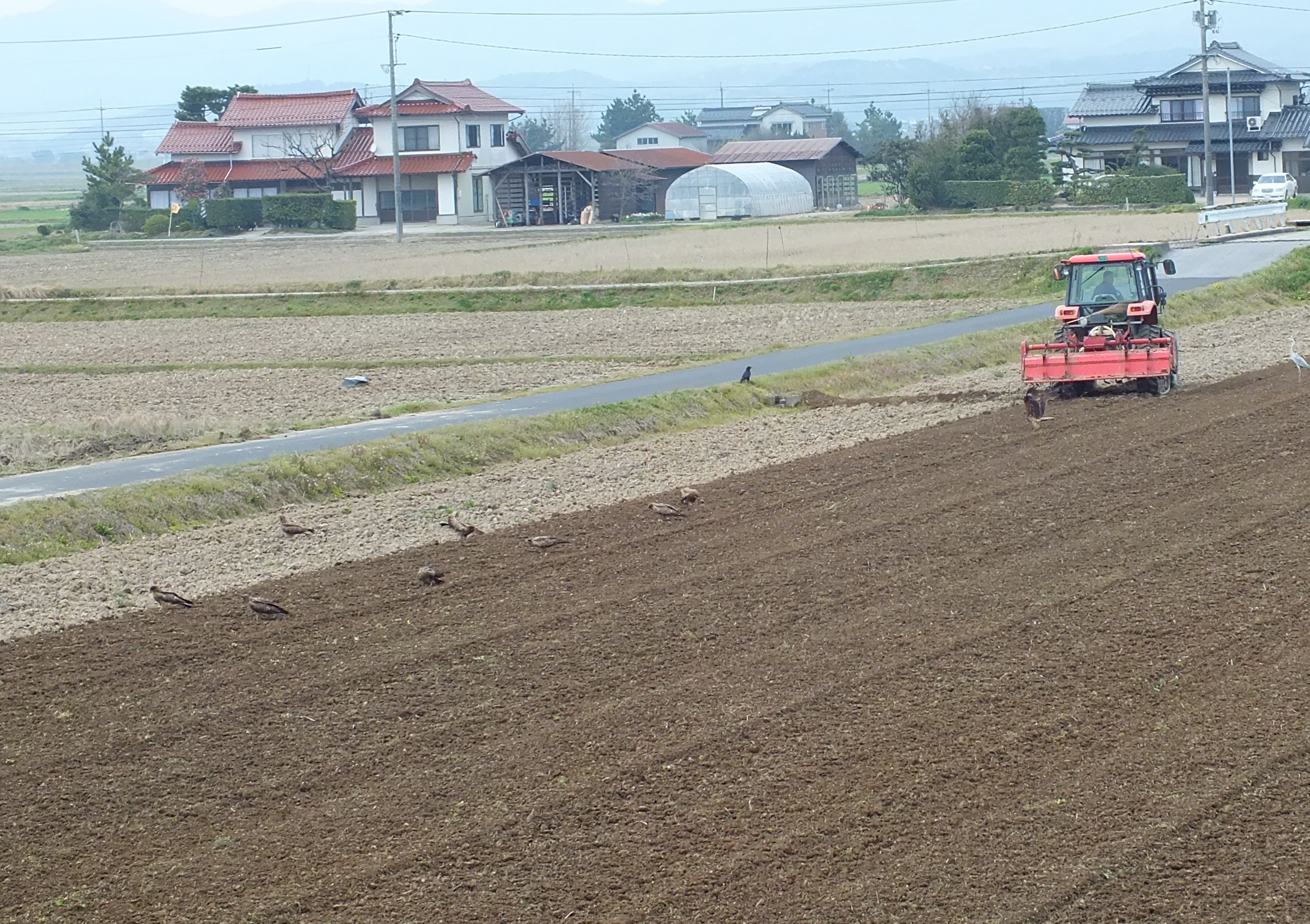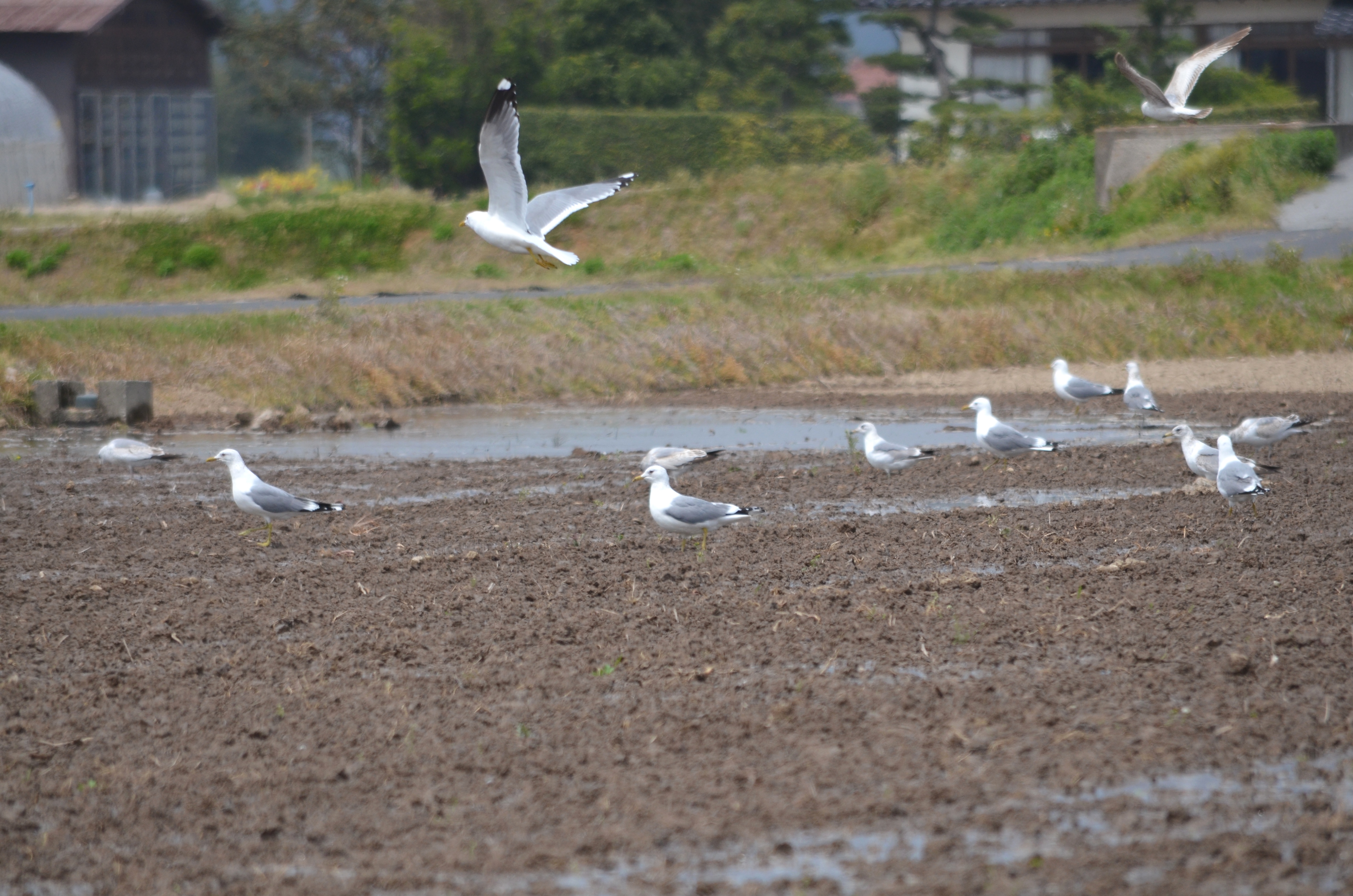 田んぼでは、田植えに備えて荒起こし、水掛け、代掻きなどの作業が始まりました。大きなトラクタがやってきて、田を耕していくと、土の中にいるミミズなどの虫や蛙などの小動物を食べようと、カラス、トビ、コサギ、アオサギ、カモメ、カモなどいろいろな鳥たちが集まってきます。