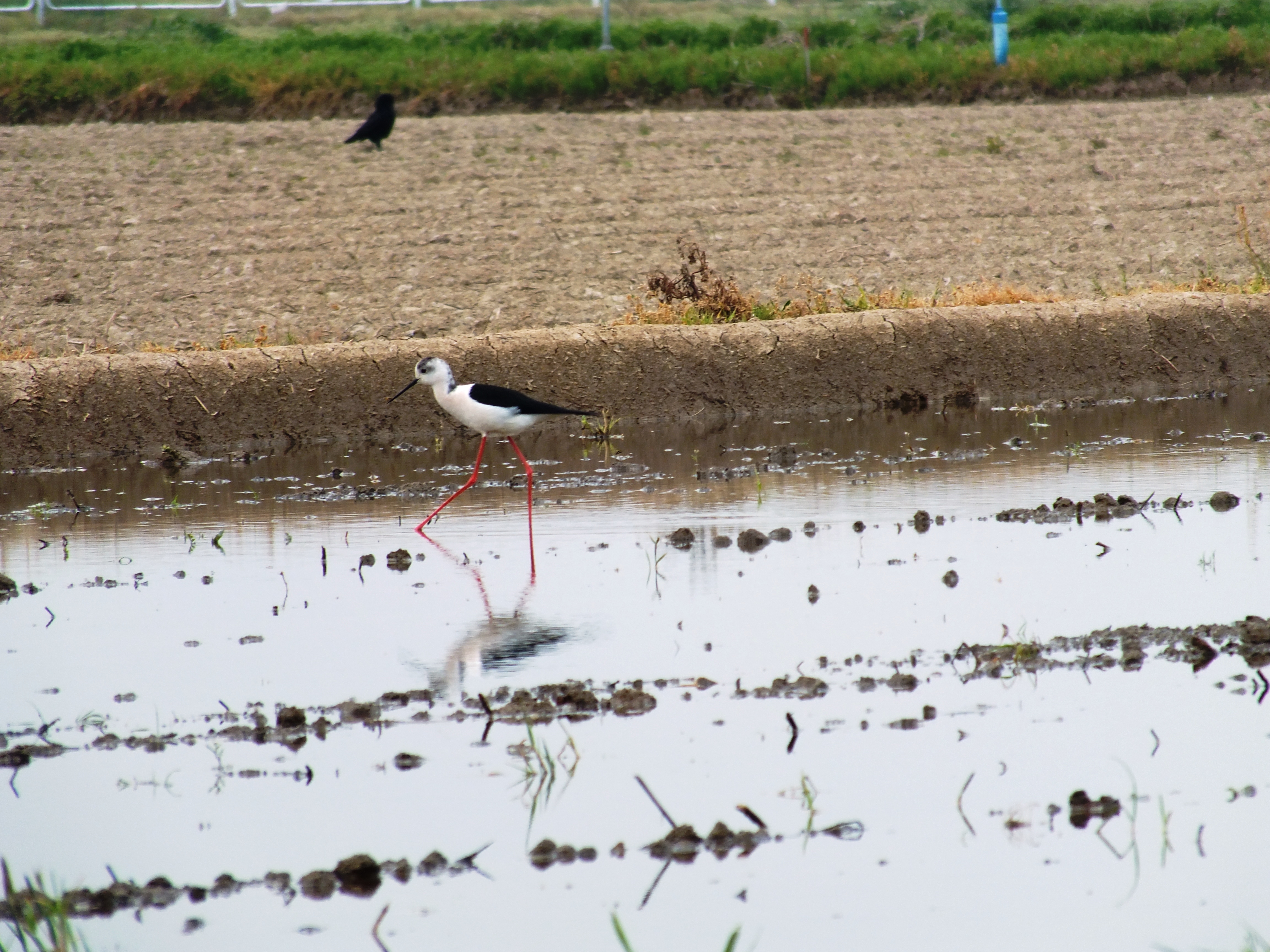 その中には珍しいセイタカシギも見ることができます。ピンクの長い脚で水の張られた田んぼの中を優雅に歩き回っています。