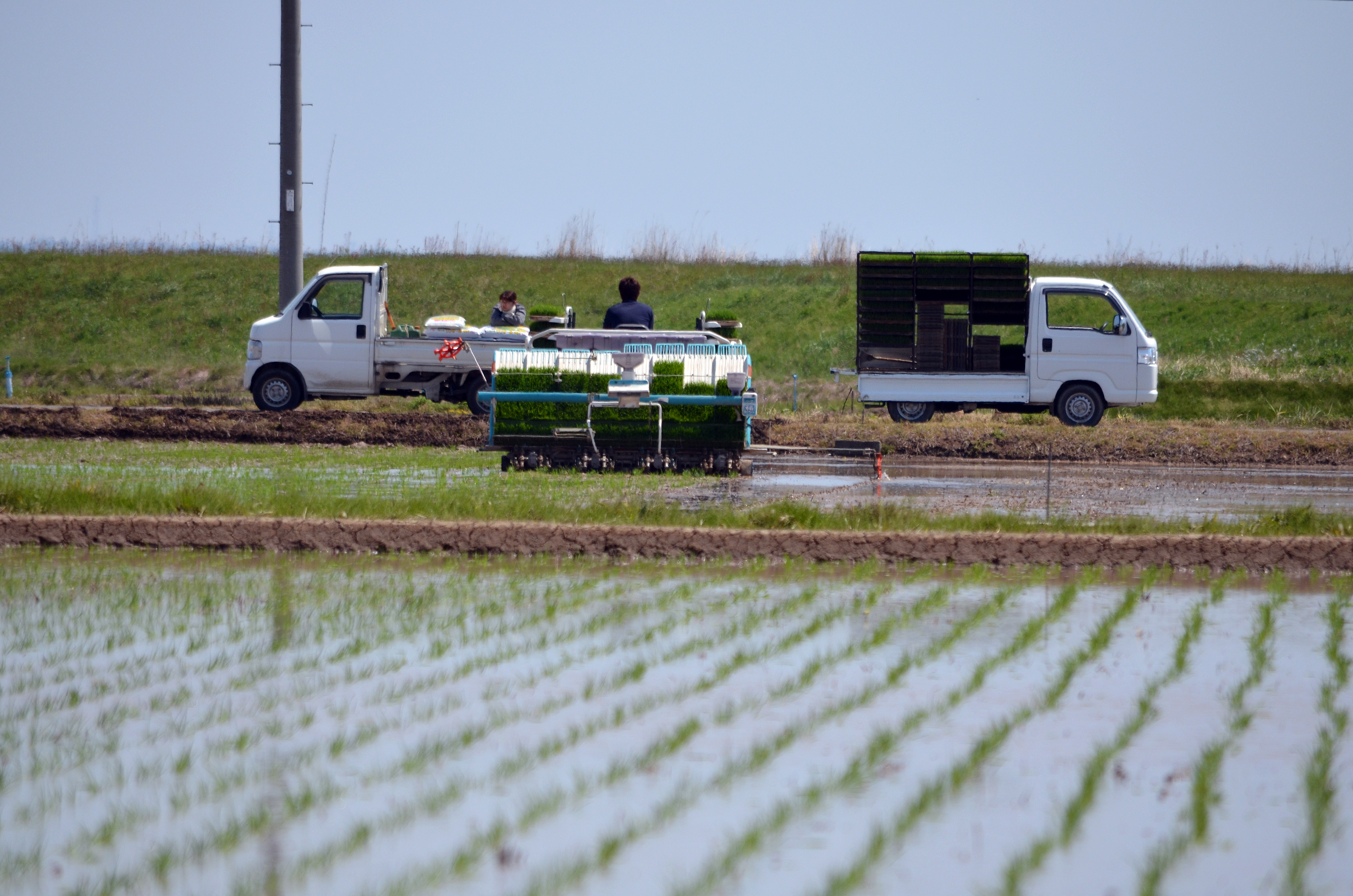 今年も田植えの季節がやってきました。早い田んぼでは先日から代掻きが行われていましたが、今朝から田植えが始まりました。黄砂で少し霞んでpm2.5も飛んでいるということですが、それを除けば快晴で風もなく暖かで絶好の田植え日和です。大規模耕作農家の二代目の若夫婦が8条植えの大きな田植え機で朝早くから一所懸命作業をしていました。