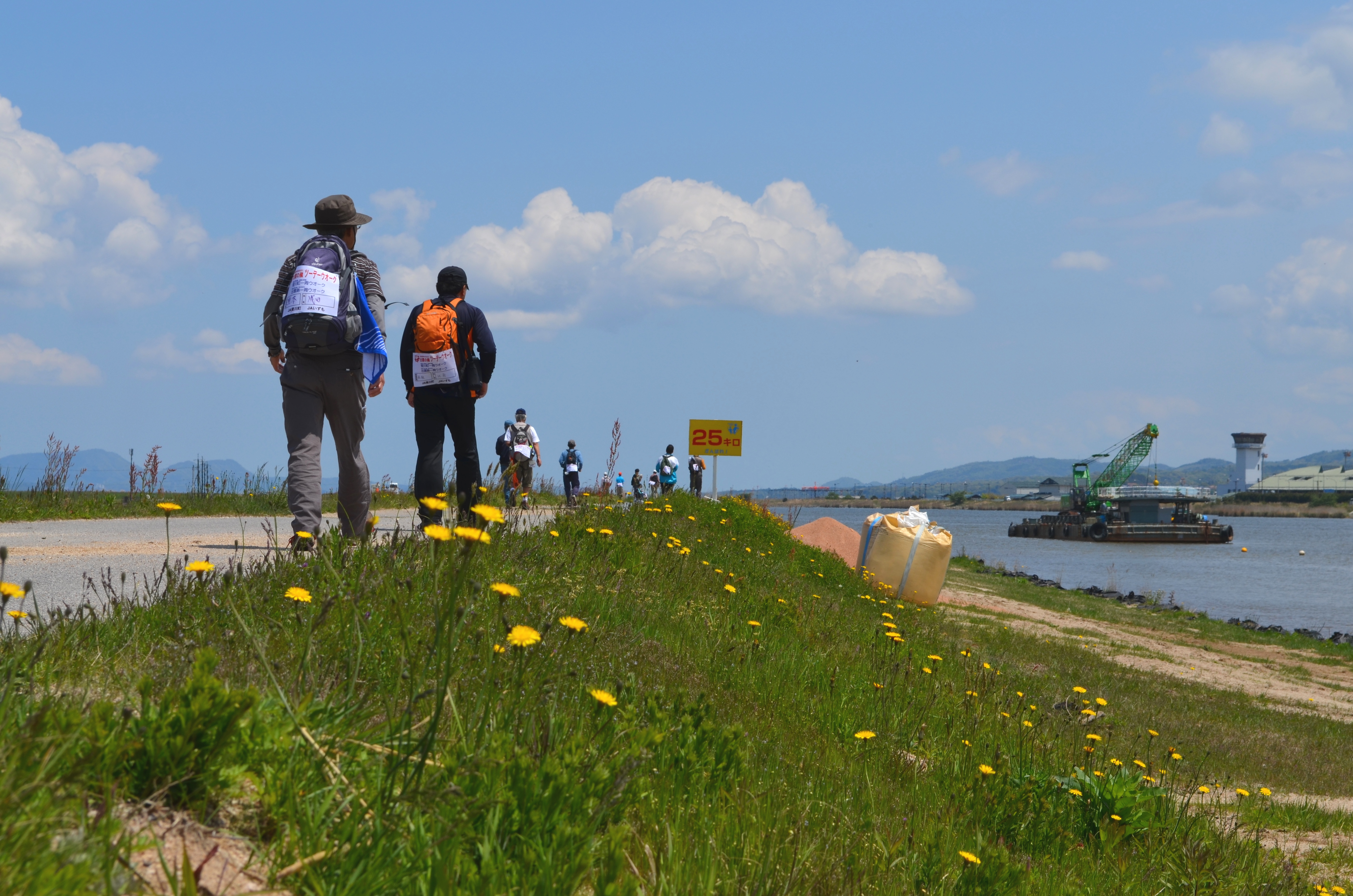 今年で22回目を迎えるという斐川町一周ウォークが、憲法記念日の3日に行われ、多くの人たちが十四間川の堤防を歩いて行きました。今年は風もなく気温もさほど高くなく歩くには絶好のコンディションで、みんな心地よさそうに歩いていました。