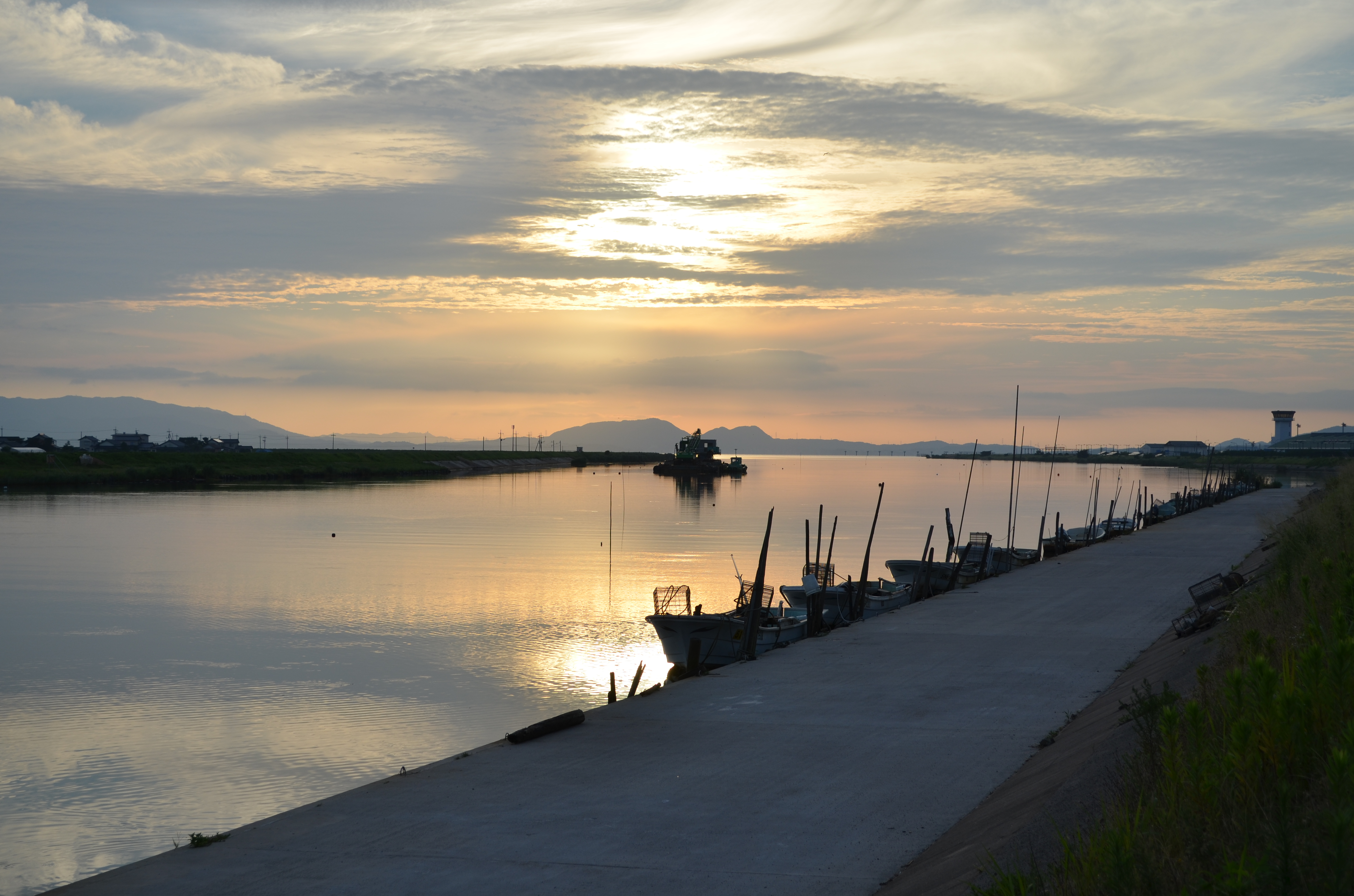 梅雨に入って、ここのところ毎日どんよりとした天気が続き、なかなかシャッターを切るような景色に恵まれませんでしたが、今日は一刻すごい勢いで夕立が降り、その後雨で空中の埃が全部流し落とされたように空気が澄んで、島根半島の北山山地に落ちていくきれいな夕日を拝むことができました。
