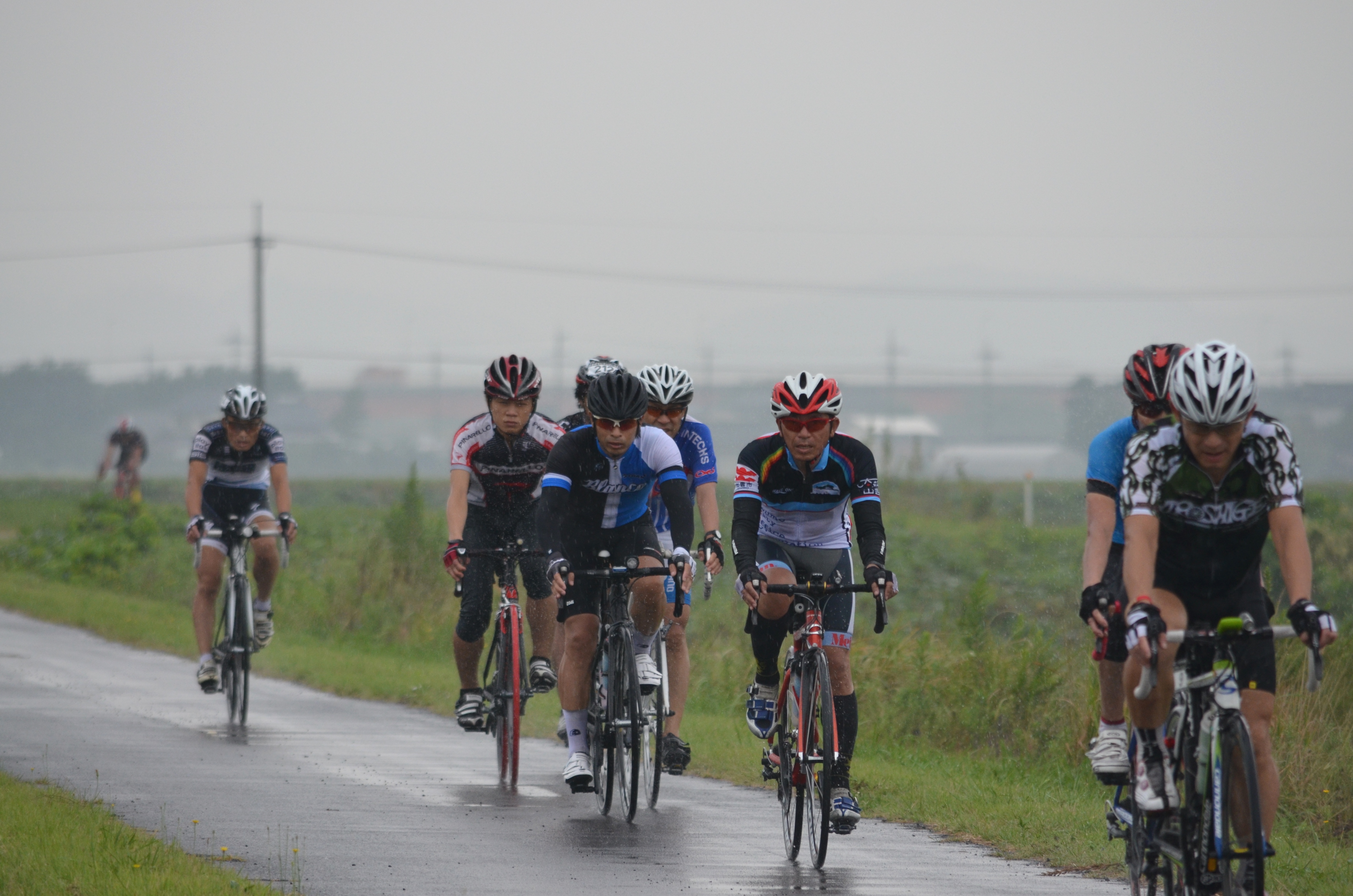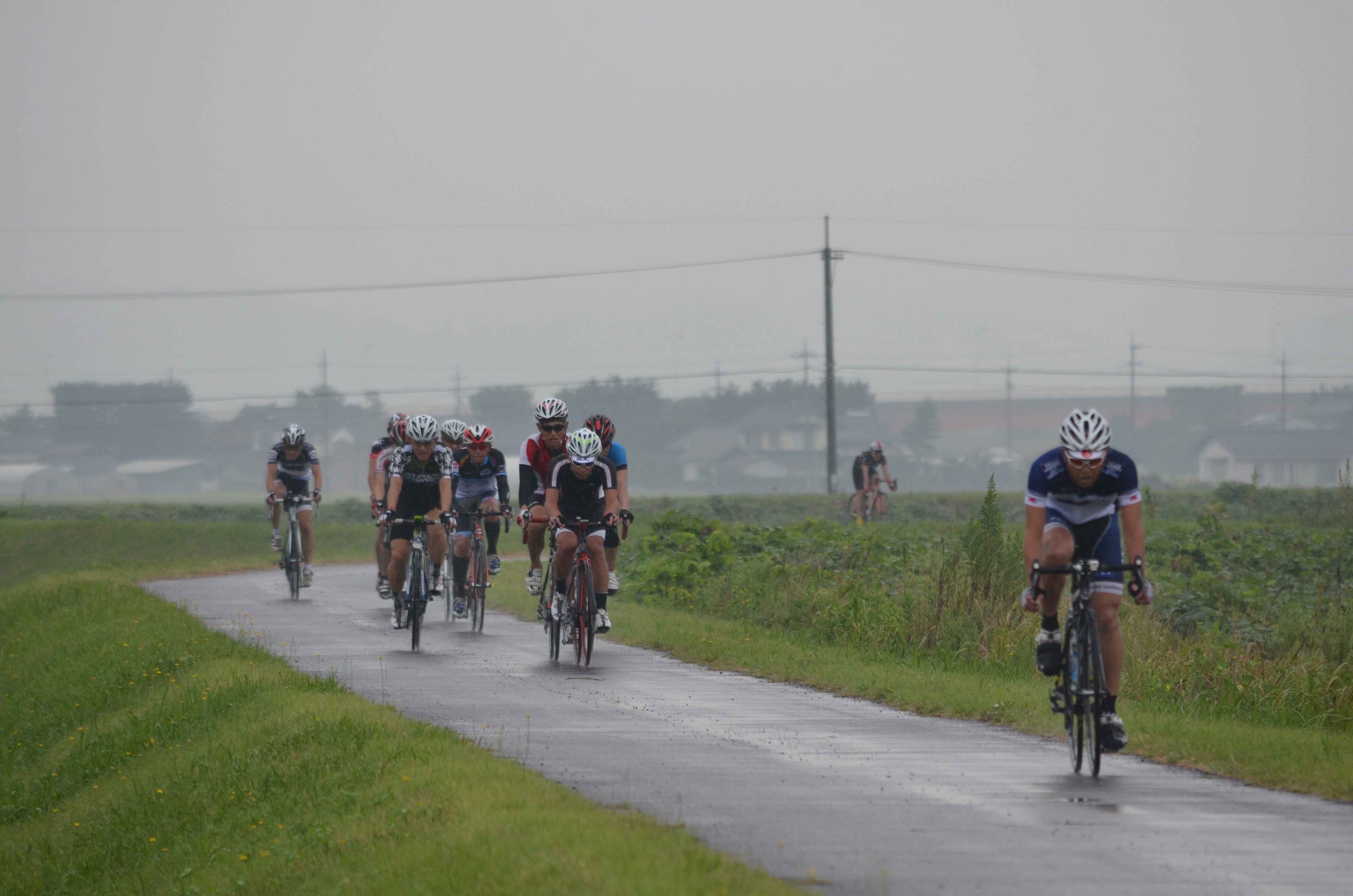 なぎさ公園に隣接するシジミ漁の船着き場付近でライダーたちの到着を待っていると、8時40分過ぎ、台風18号の影響で朝から降り続く小雨をものともせず、バイクに先導された先頭グループが姿を現しました。まだコースの前半ということもあり、みんな元気そうになぎさ公園を過ぎて、稲穂の残る田んぼの中の農道に消えて行きました。できれば、ここで堤防を降りないで十四間川の方まで走ってもらいたいものですが、ここから先は何か所も車止めがあるため、自転車も進めないのが残念です。