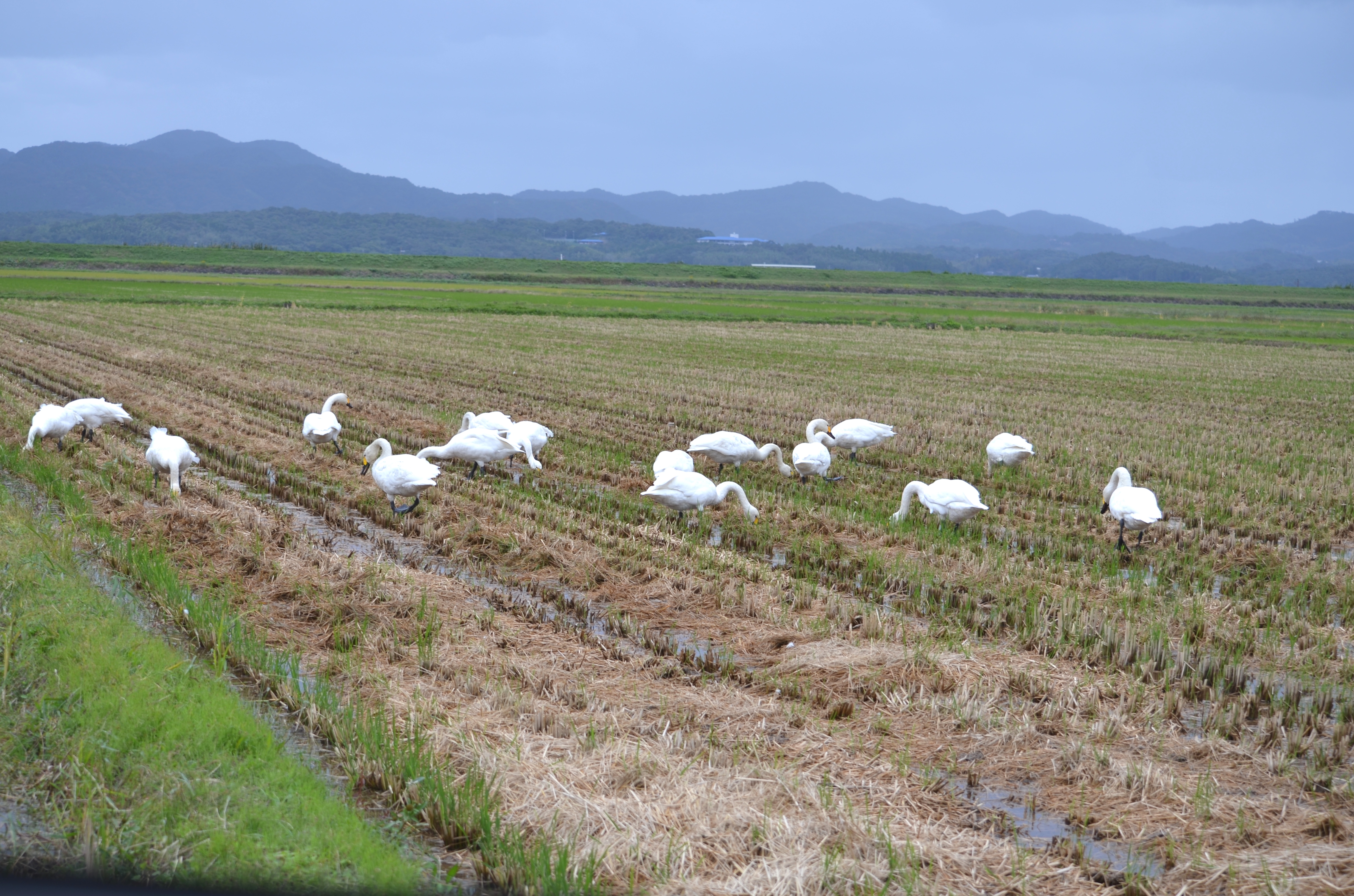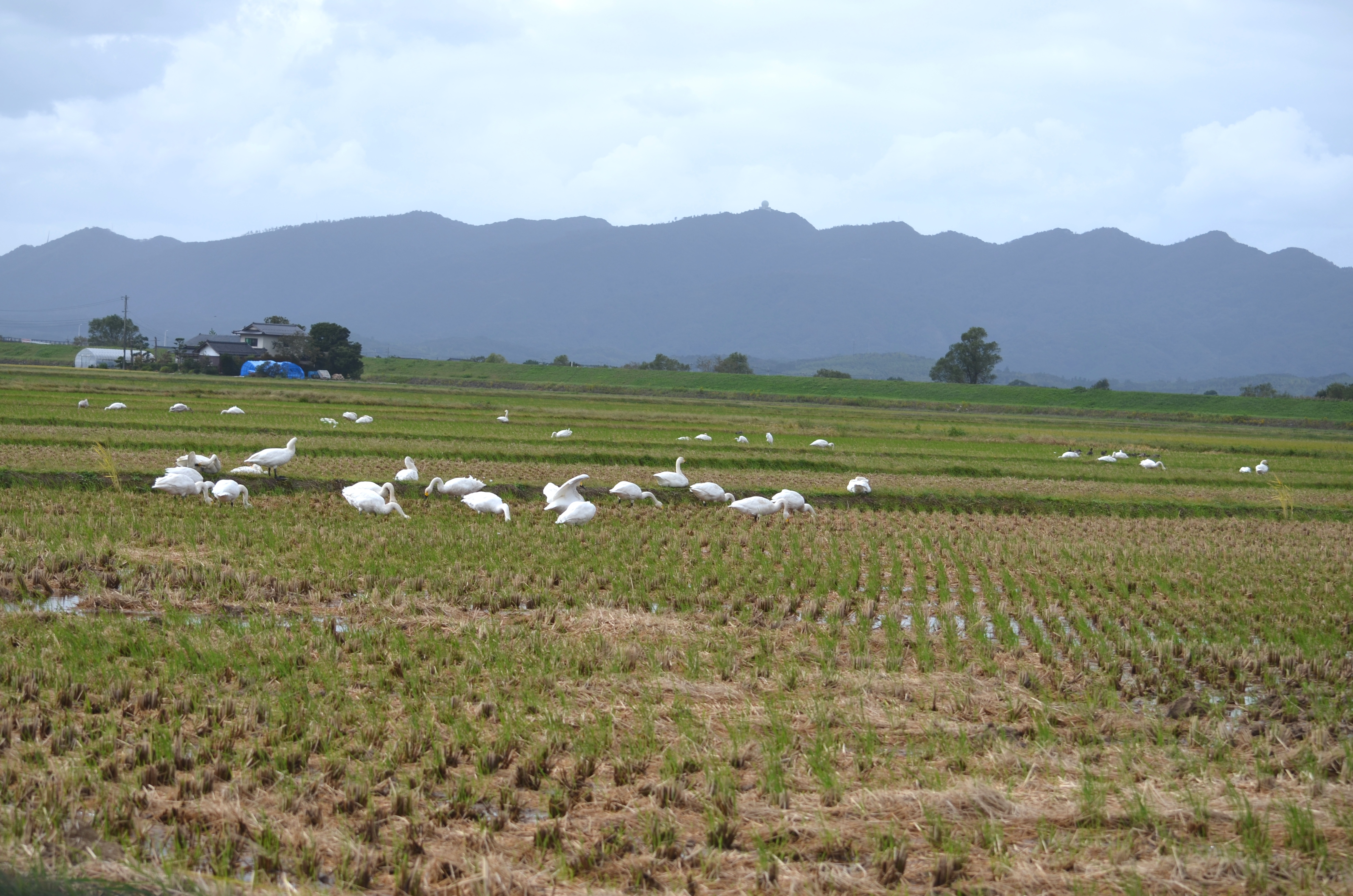 今日宍道湖西岸のなぎさ公園近くの田んぼにコハクチョウの群れが飛来しているのを確認しました。まだ体が灰色の幼鳥を含め、45羽が、うずくまって背中に頭を乗せ、羽根の間に顔をうずめるようにして長旅の疲れを取ったり、餌を食べたりしていました。今日の山陰中央新報に、昨日米子の水鳥公園に昨年より6日遅れでコハクチョウ21羽が初飛来したことが紹介されていましたが、簸川平野にやってきた45羽も、水鳥公園に飛来したコハクチョウと一緒にやってきたのかもしれません。