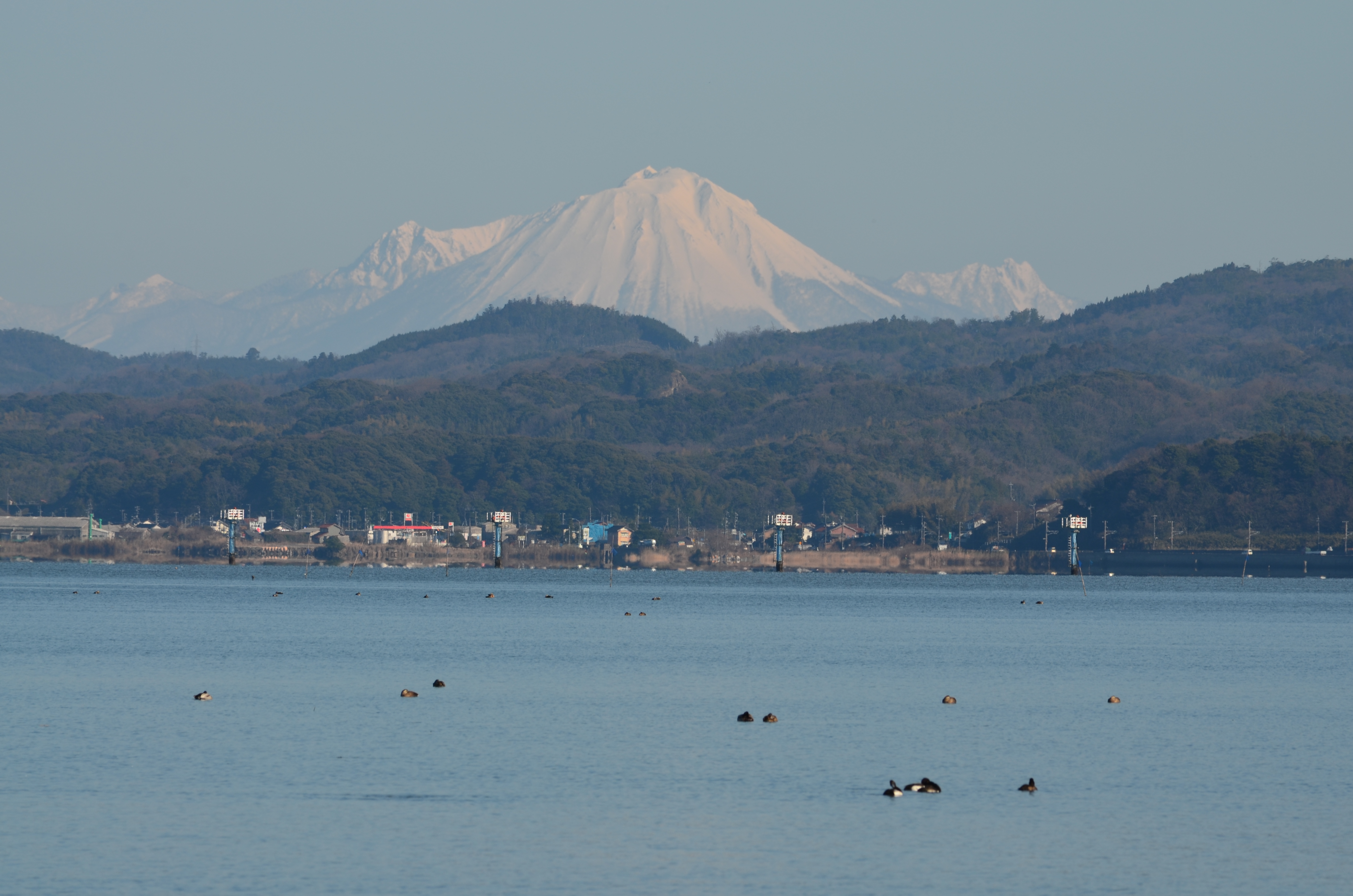 今日は、雲一つない快晴で、風もなく暖かい一日でした。宍道湖の西岸からも、雪を全身に頂いて真っ白に輝く大山が青空にくっきりとそびえていました。