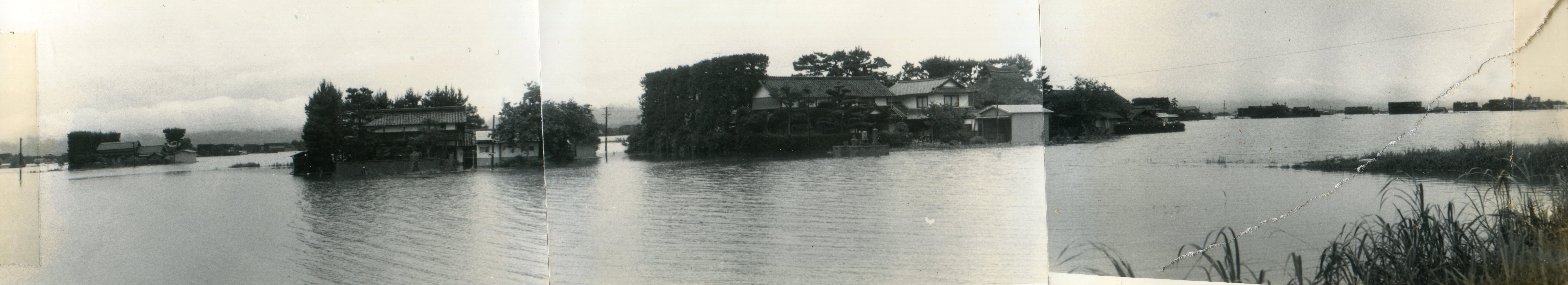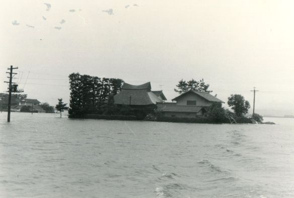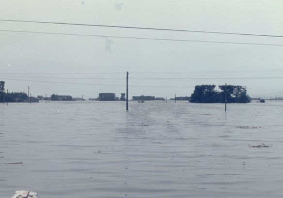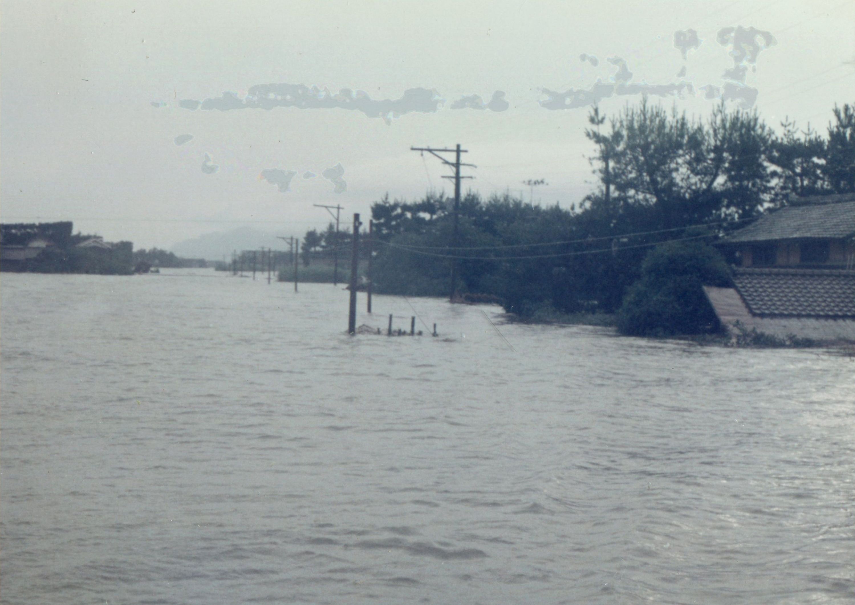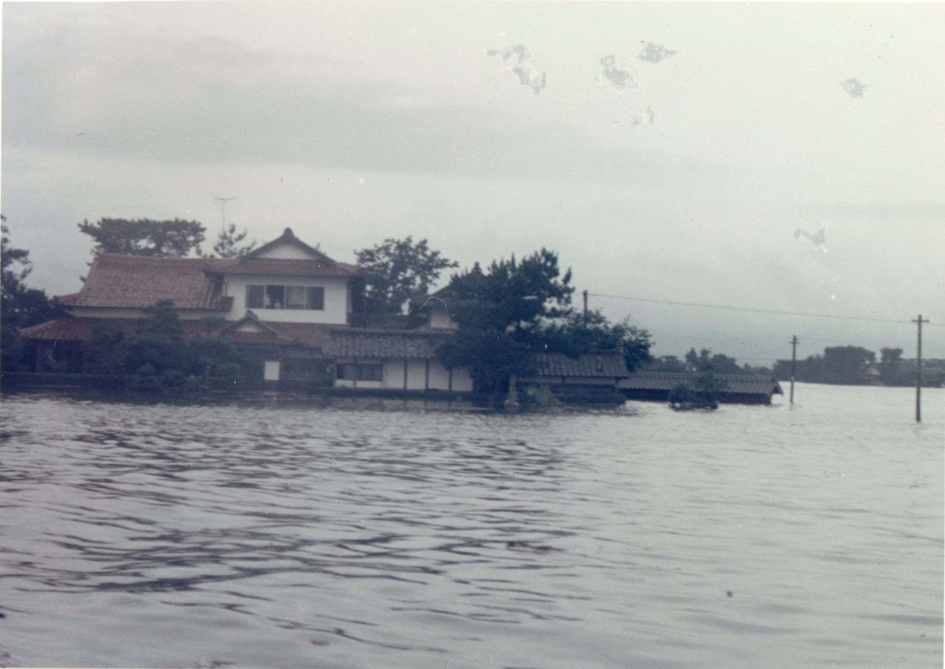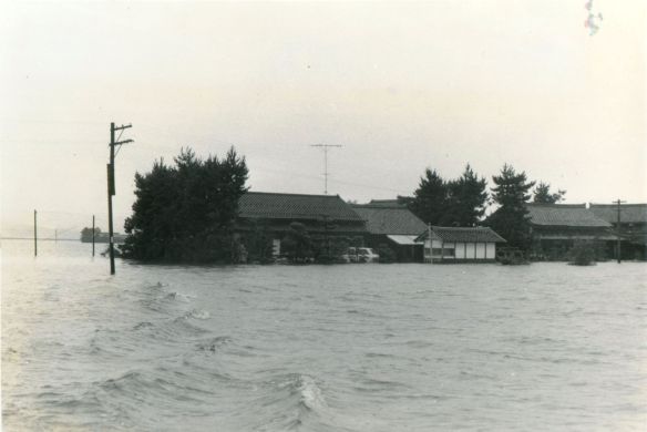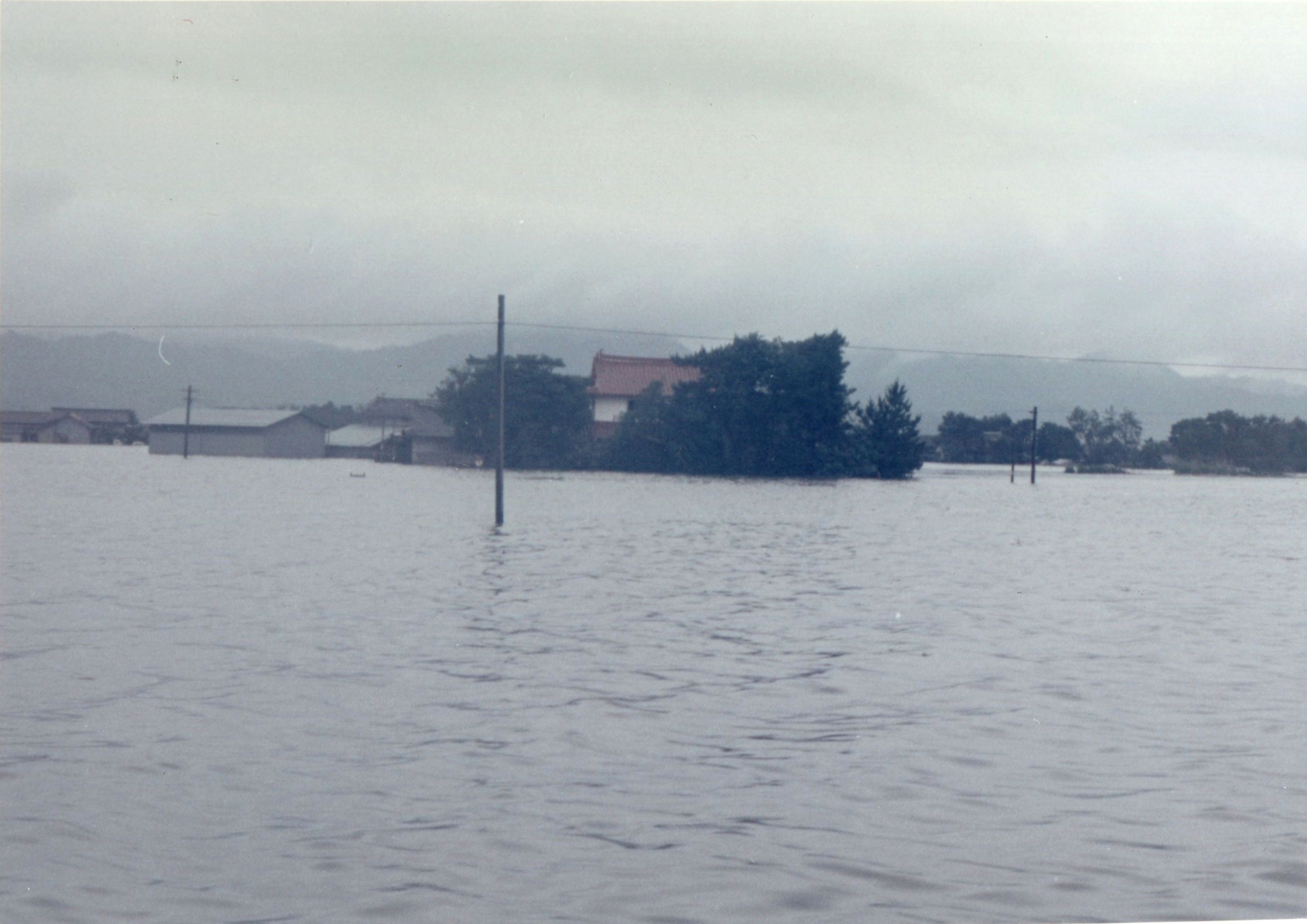 斐川町の47水害の記録(元斐川町職員錦織勉氏撮影) ここに掲載した写真は、旧斐川町役場に勤務されていた錦織勉氏が撮影され、アルバムに整理して保存されていたものです。同氏の承諾を得て、公開させていただくものです。 昭和47年に現像、焼き付けされ、アルバムに貼られていたものをスキャナを用いて取り込んでいます。したがって、画像の劣化があり不鮮明となっておりますことをご了承ください。 写真の下に付した説明は、錦織氏がアルバムに記載されていたものに多少の補足を加えたものです。また、錦織氏によるメモのない写真についても、場所等が特定できるものについては、適宜こちらで説明を付させていただいております。 7/12 午後2時 大字沖洲昭和地内 7/12 午後2時 大字荘原町島灘地内 沖洲天満宮参道から天満宮を望む(大字沖洲) 十四間川決壊箇所(大字黒目松江分地内) 7/13 午後2時 大字沖洲瑞穂地内 7/13 午後3時 大字三分市川東上組地内 7/13 午後4時 大字黒目松江分地内 7/13 午後4時 大字三分市六丁場周辺 7/13 午前10時 大字三分市川東上組地内 7/13 午前10時 葉煙草水田冠水 7/14 午後1時 大字坂田碇地内 大字黒目松江分地内(道路上) 大字三分市東部の住宅 大字三分市六丁場地内 大字三分市六丁場から三分市東部を撮影 大字三分市六丁場湖岸部(水深2.5m) 豚の救出作業(7/13大字三分市地内) 牛の救出作業 チューリップ球根搬出作業(7/13大字三分市) 伊達県知事視察 空港道路にて(大字沖洲瑞穂地内) 7/14 正午 県知事被災地視察 共有: X で共有 (新しいウィンドウで開きます) X Facebook で共有 (新しいウィンドウで開きます) Facebook その他 印刷 (新しいウィンドウで開きます) 印刷 いいね 読み込み中…