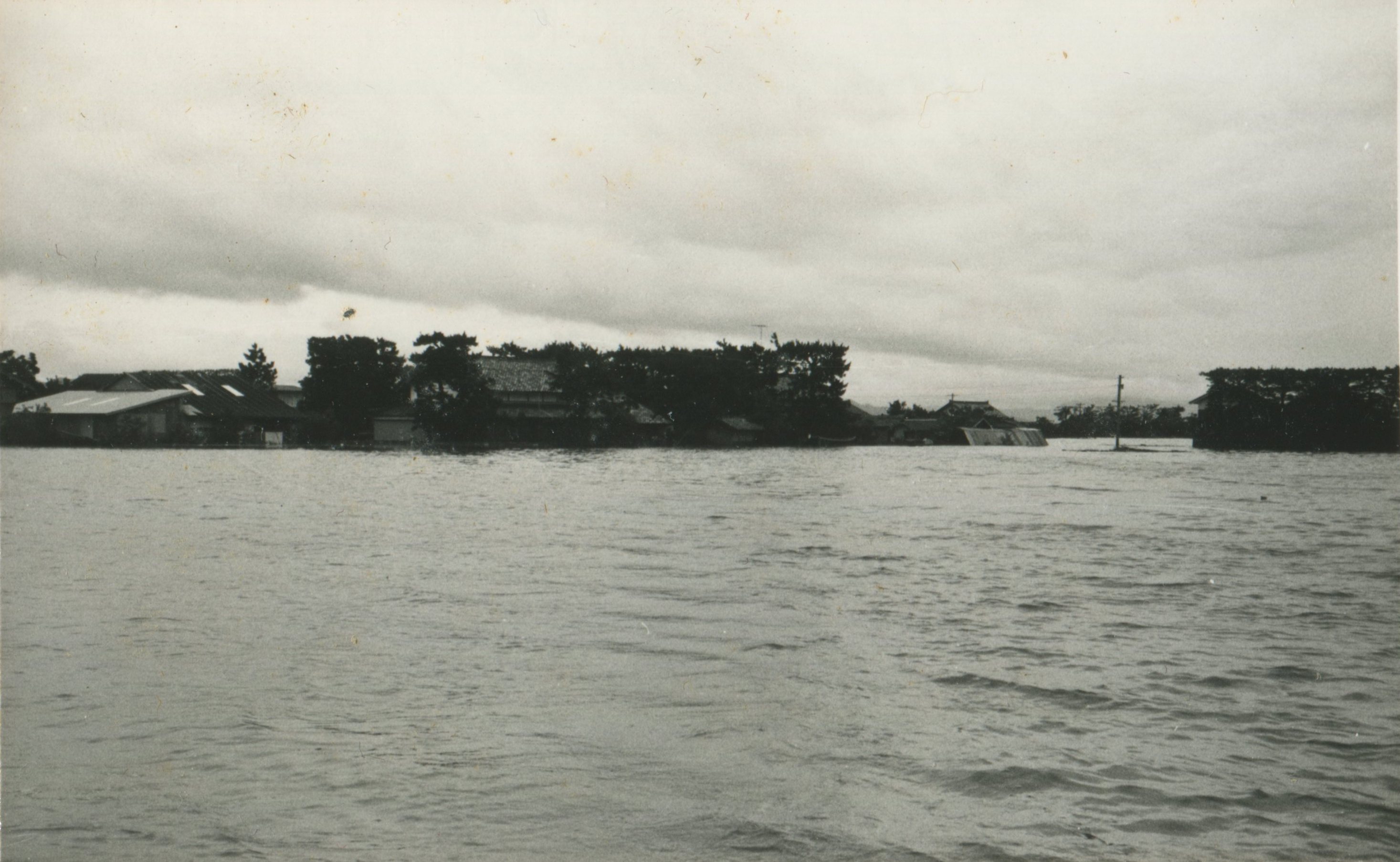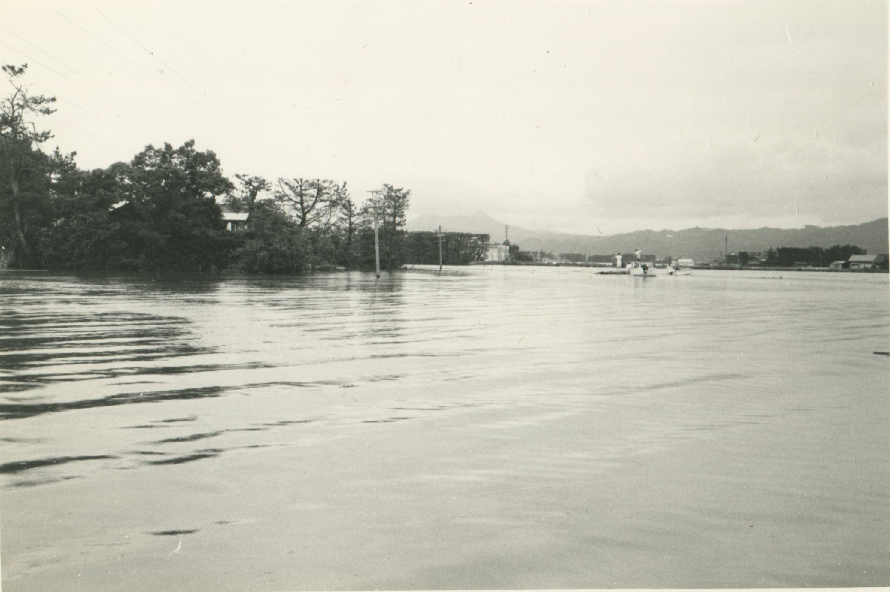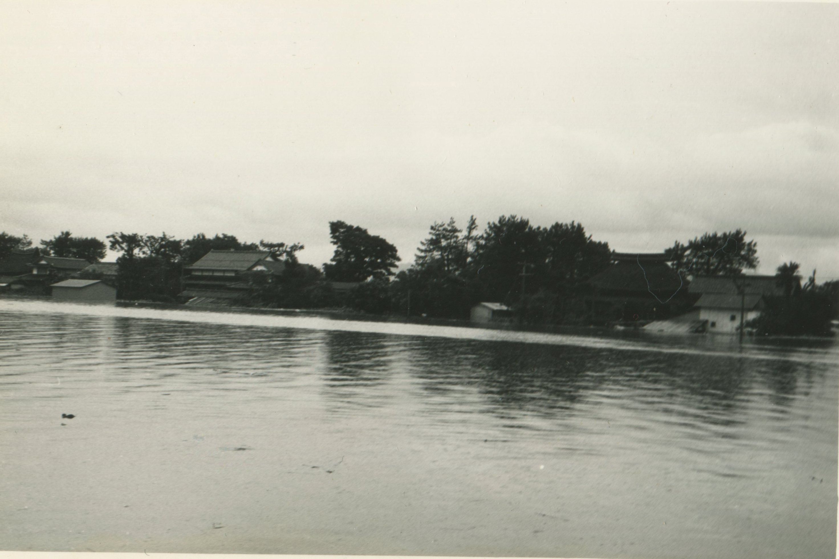 十四間川決壊箇所(堤防の向こうが松江分地区)