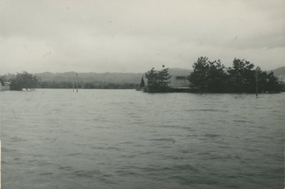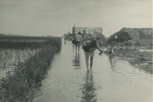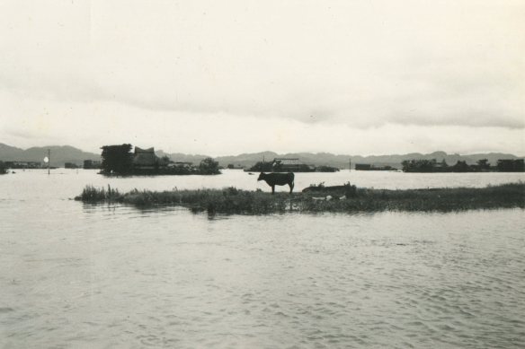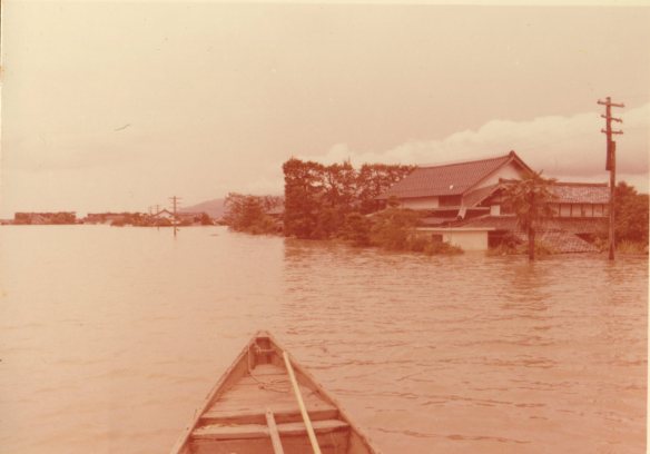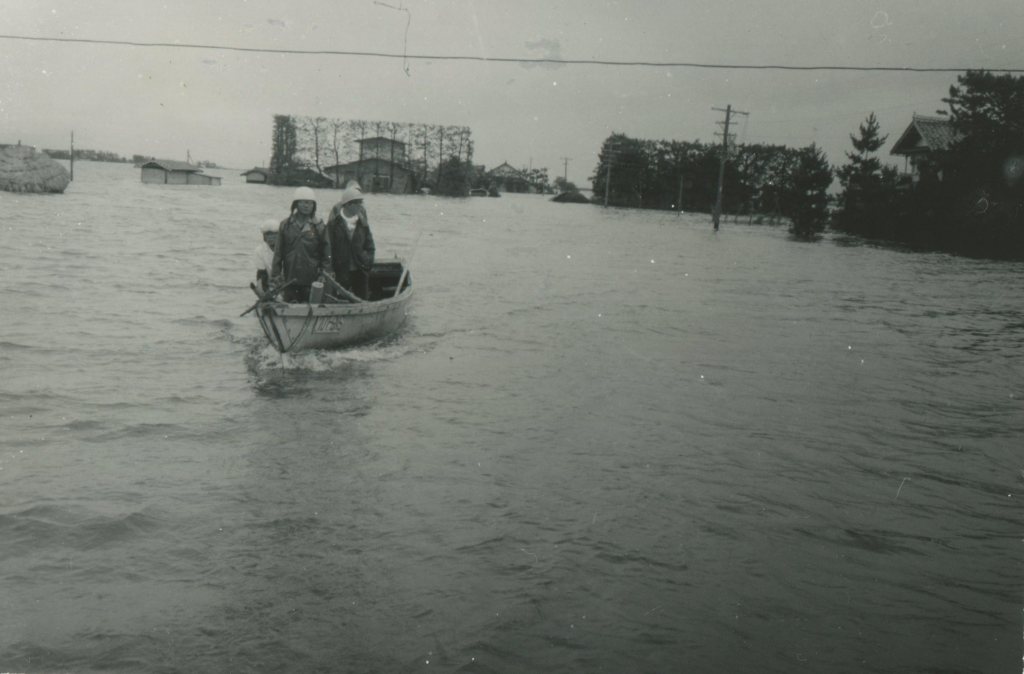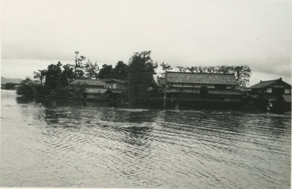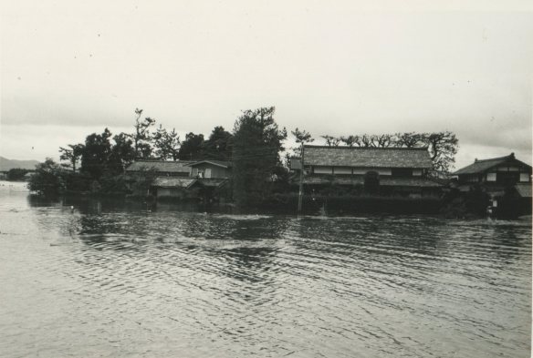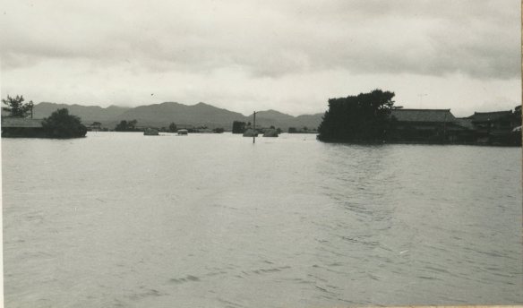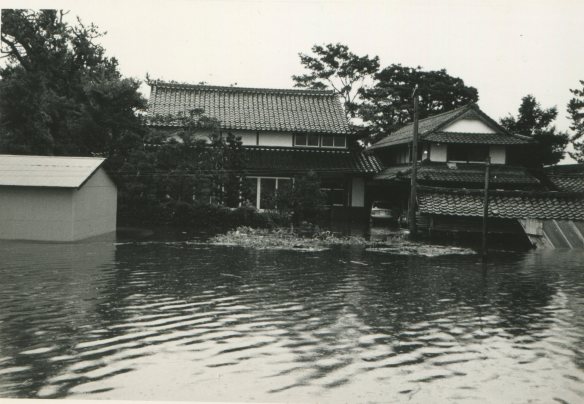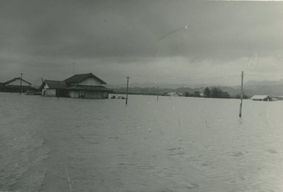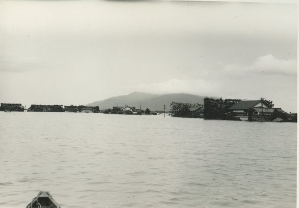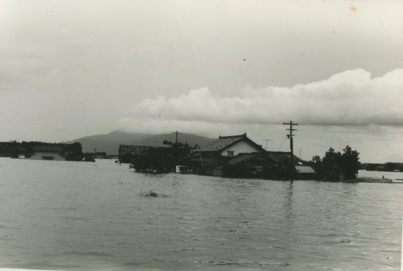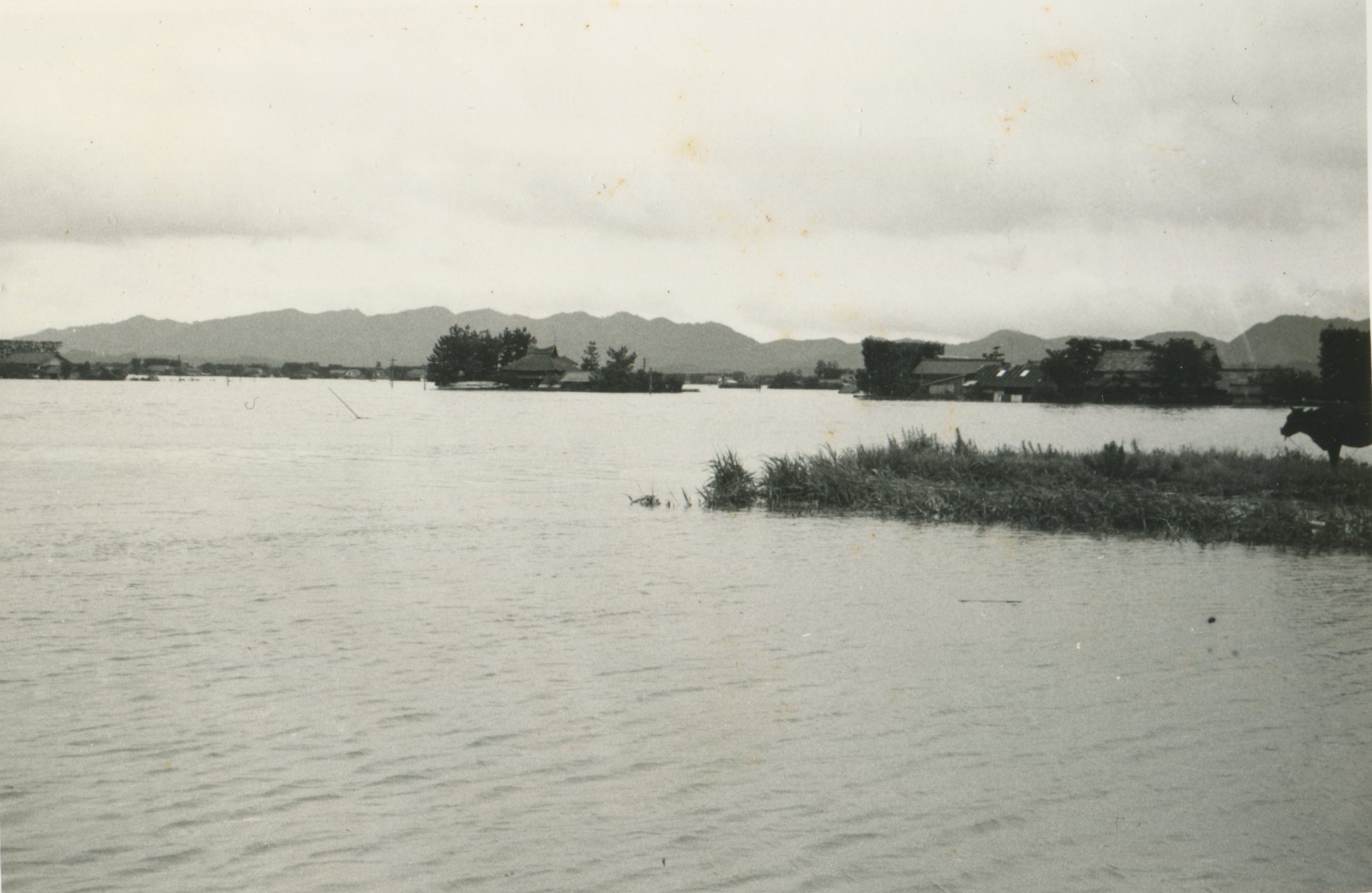 十四間川決壊箇所(堤防の向こうが松江分地区)