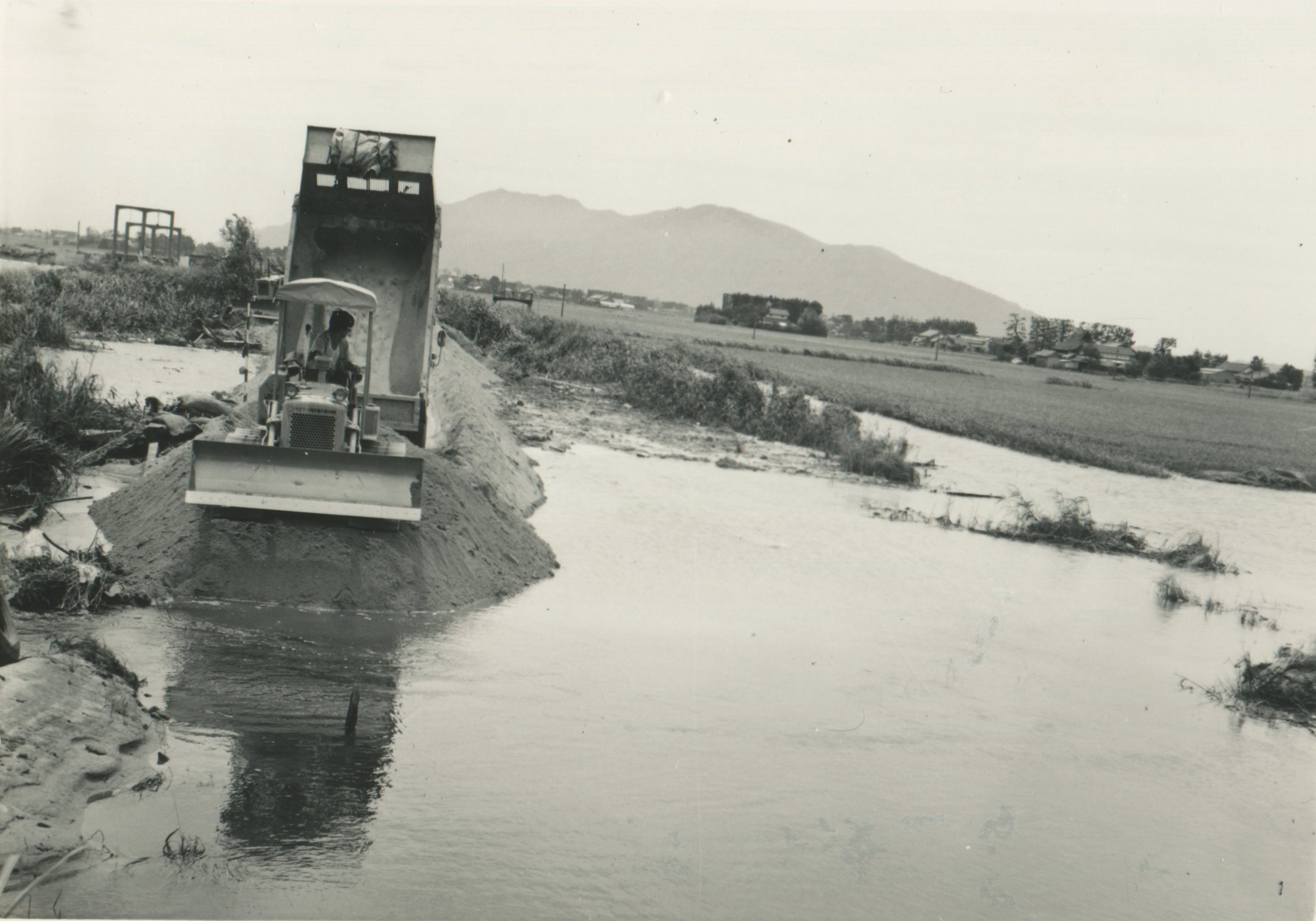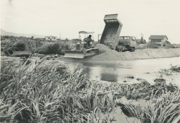 復旧工事中の十四間川堤防決壊箇所(松江分地内)